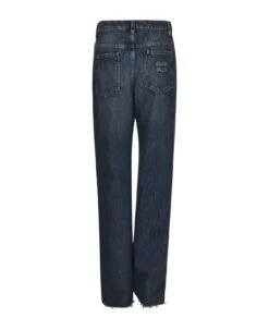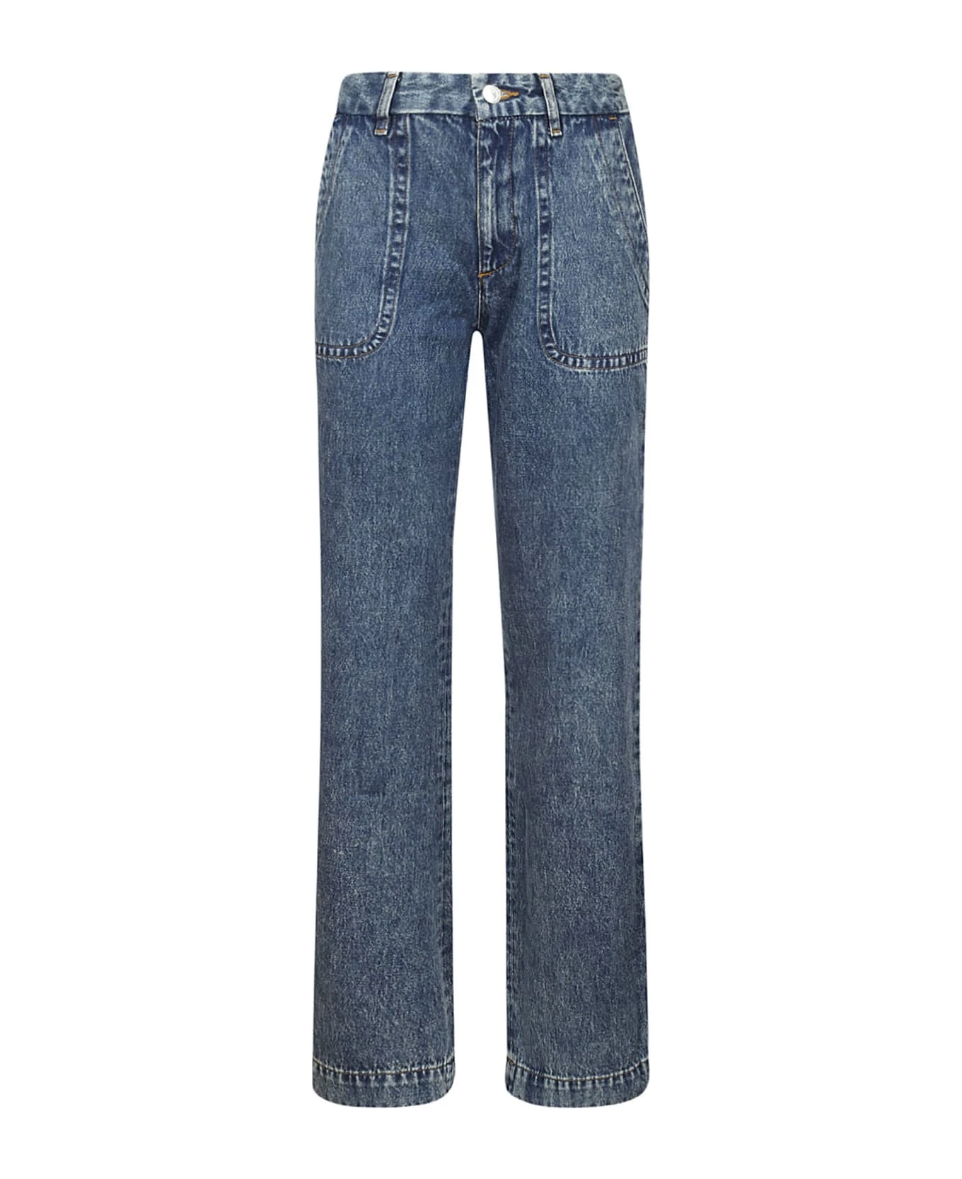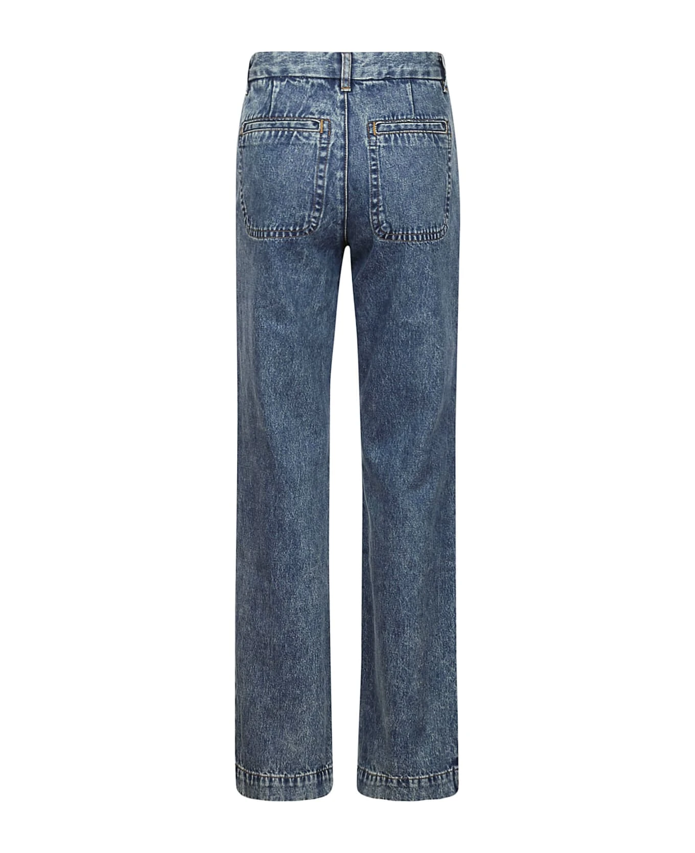 A. P. C. cotton jeans with American pockets, wide leg, belt loops, and zip and button closure.