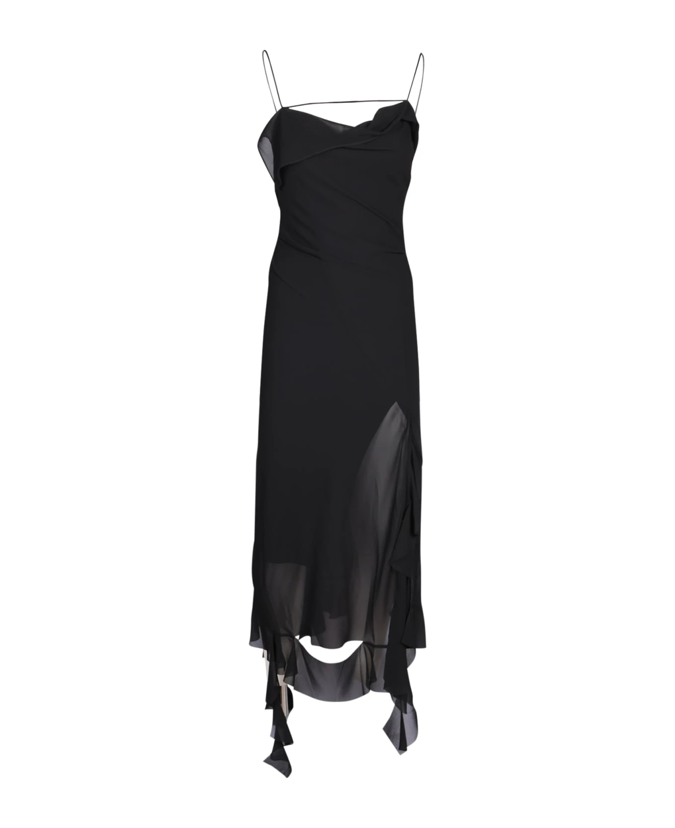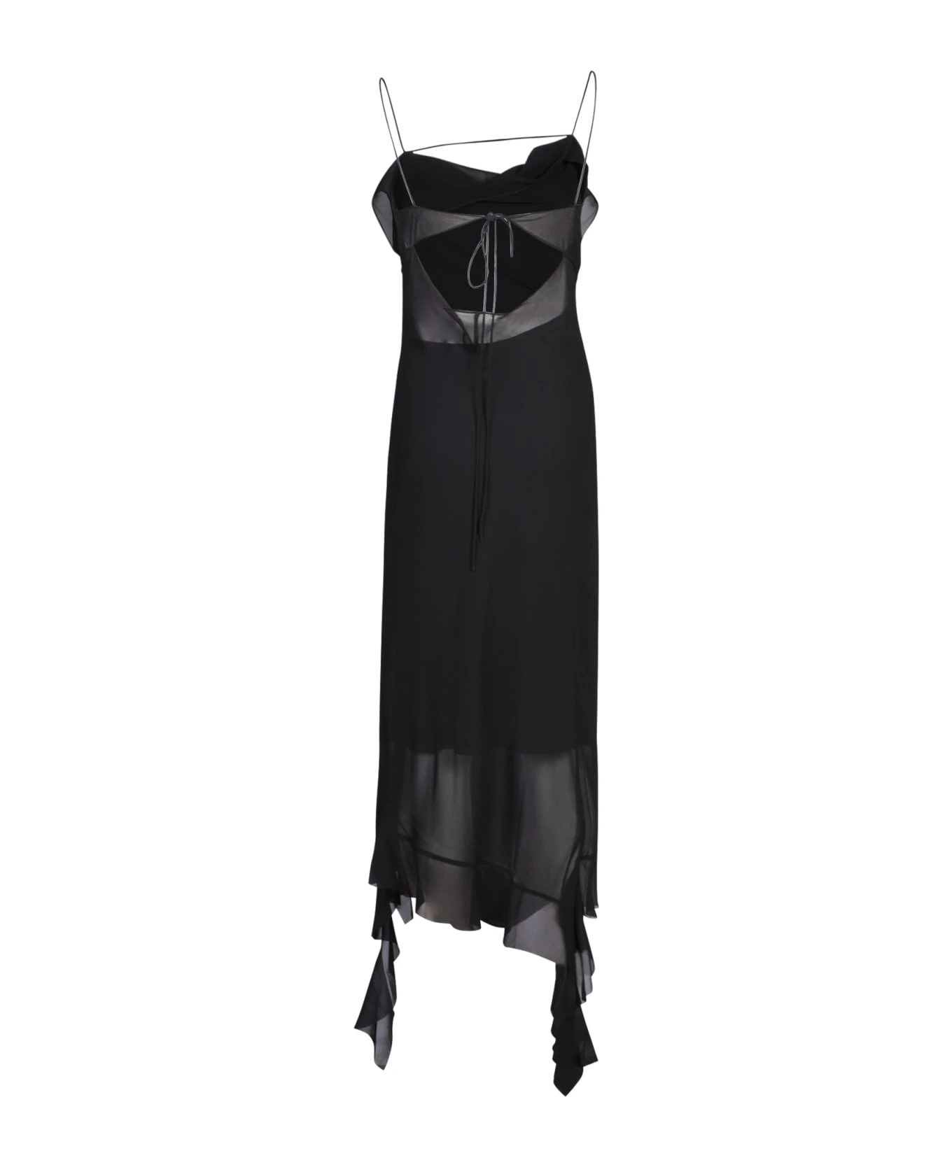 Semi-sheer construction. Sqaure neck. Spaghetti straps. Cut-out detail. Asymmetric hem. Color: black