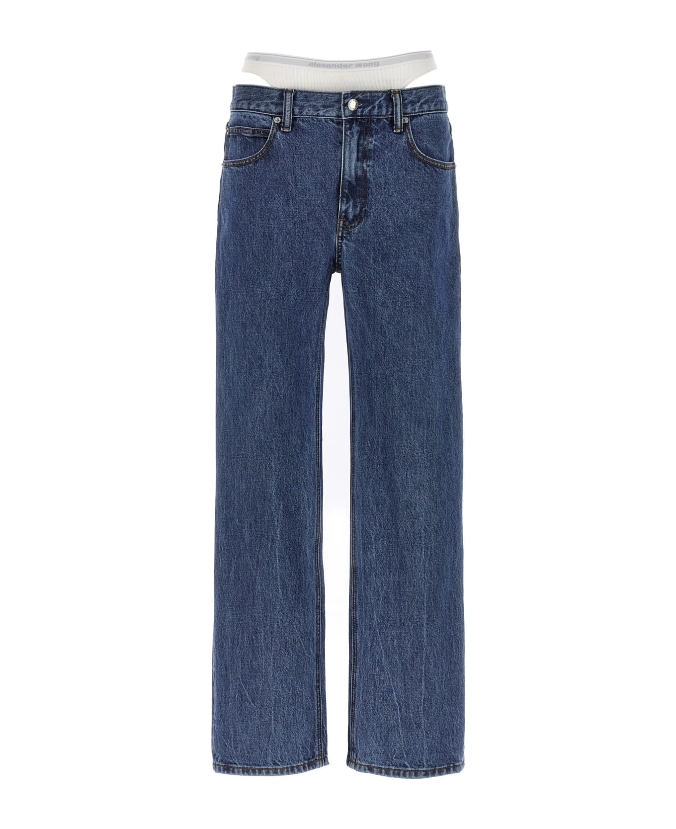 Cotton denim jeans with ribbed and elastic slip insert, zip and button closure, five pockets, leather logo tag, and wide leg.