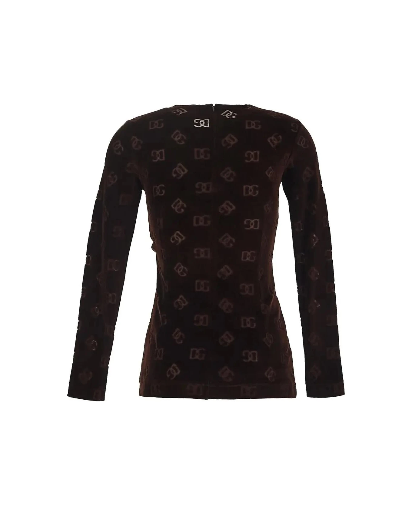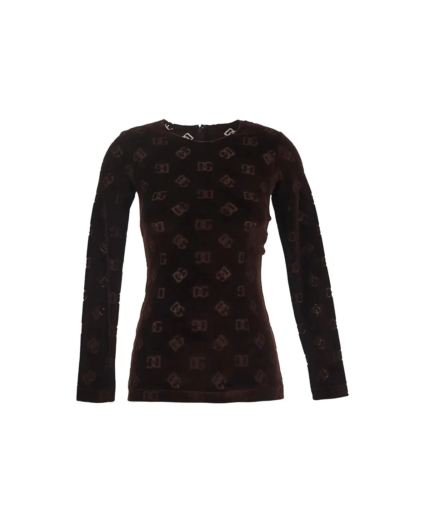 Dolce & Gabbana crew neck knitwear in dark brown velvet cotton with all-over DG logo motif, long sleeves and zip fastening at back.