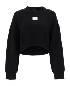 Dolce & Gabbana crew-neck sweater knitted from soft virgin wool and cashmere. Embellished with the signature logo plaque at center chest, it features a wide, boxy cut with cropped hem. The model is 177 cm tall and wears a size IT 40.
