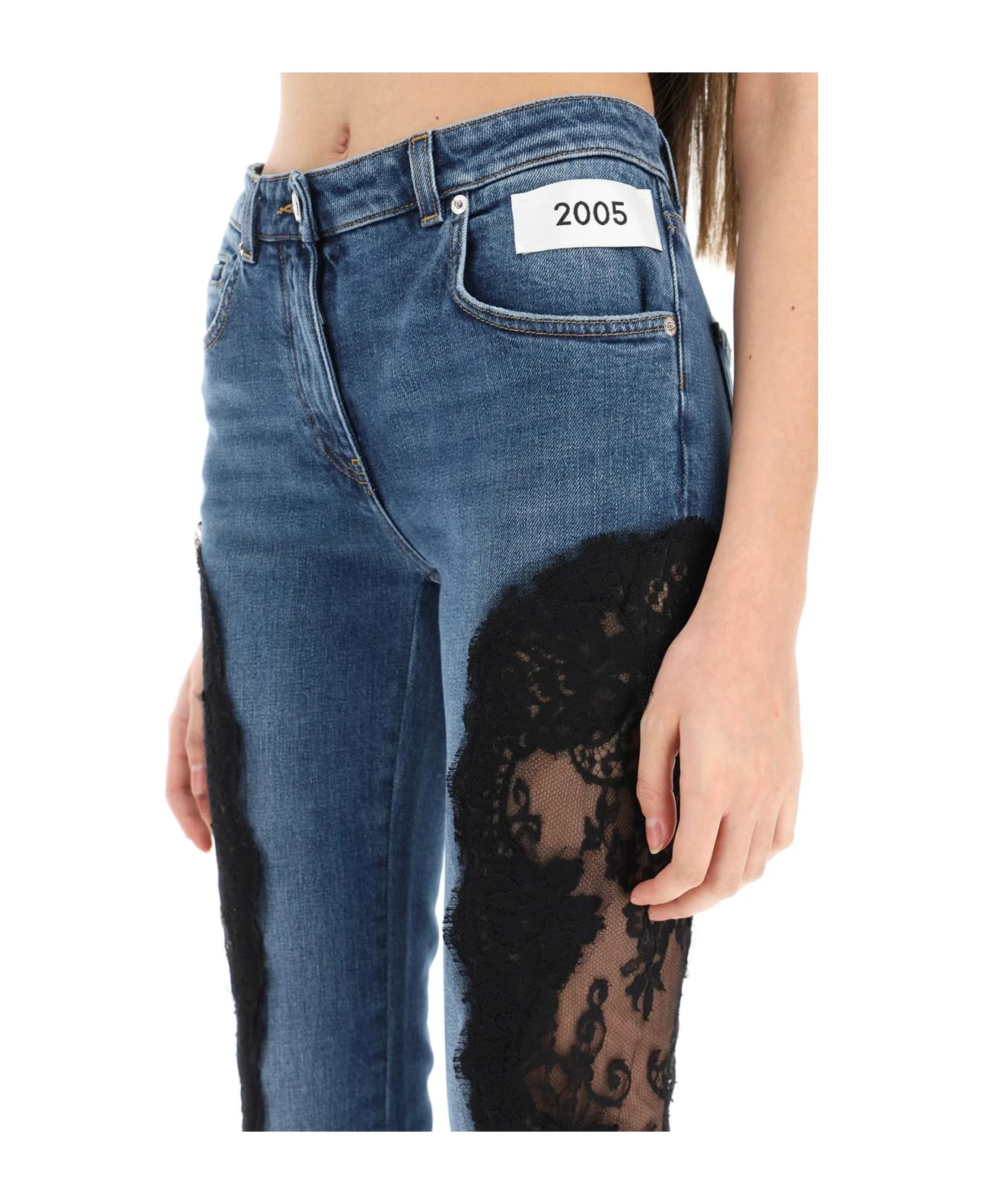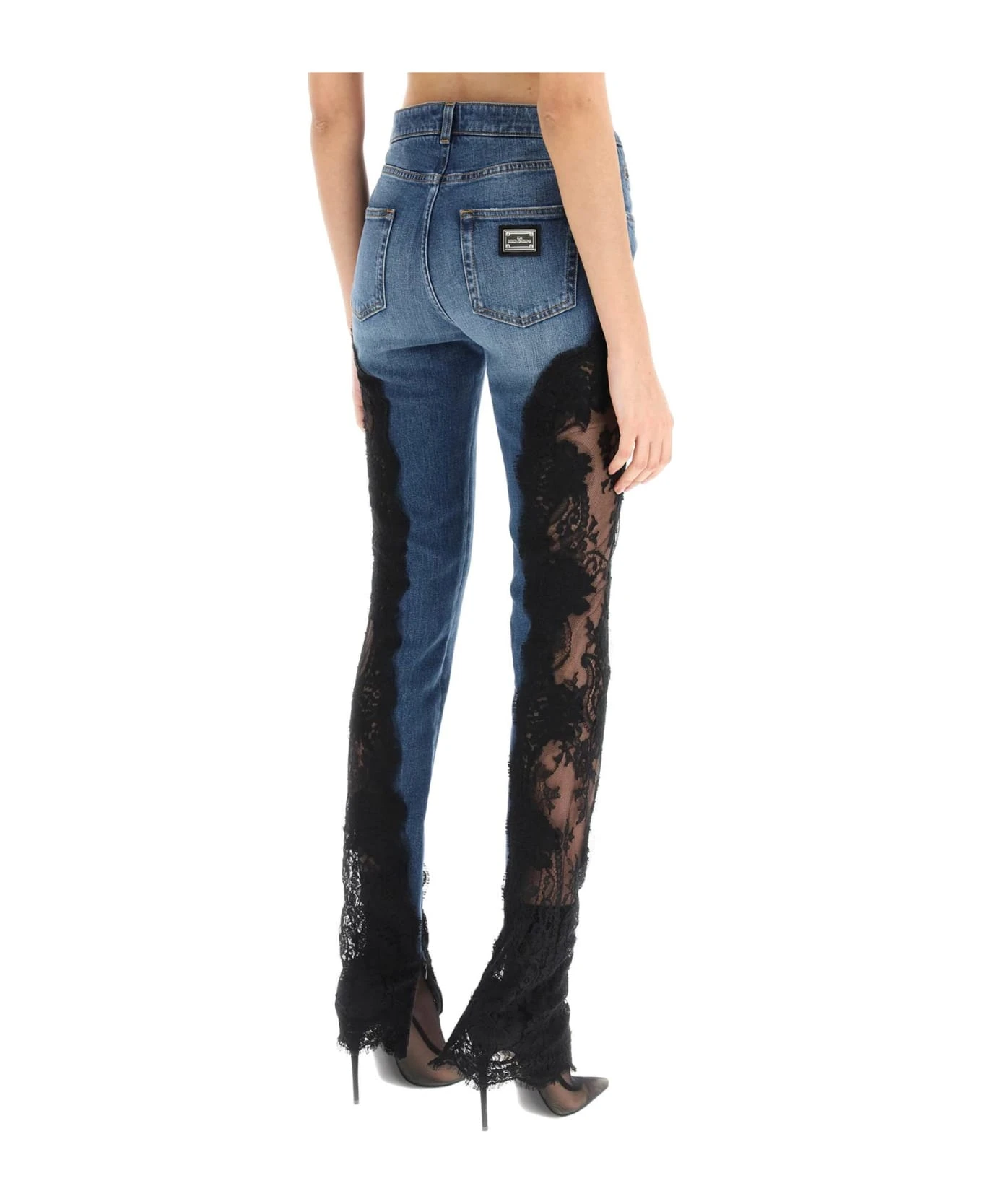 Kim Dolce&Gabbana five-pocket jeans in stretch cotton denim, embellished with contrast lace side inserts. Cut to a slim fit with mid-rise waist, they feature a zip fly with metal button, invisible zip cuffs, and the signature leather and metal logo plate on the back. The model is 177 cm tall and wears a size IT 40.