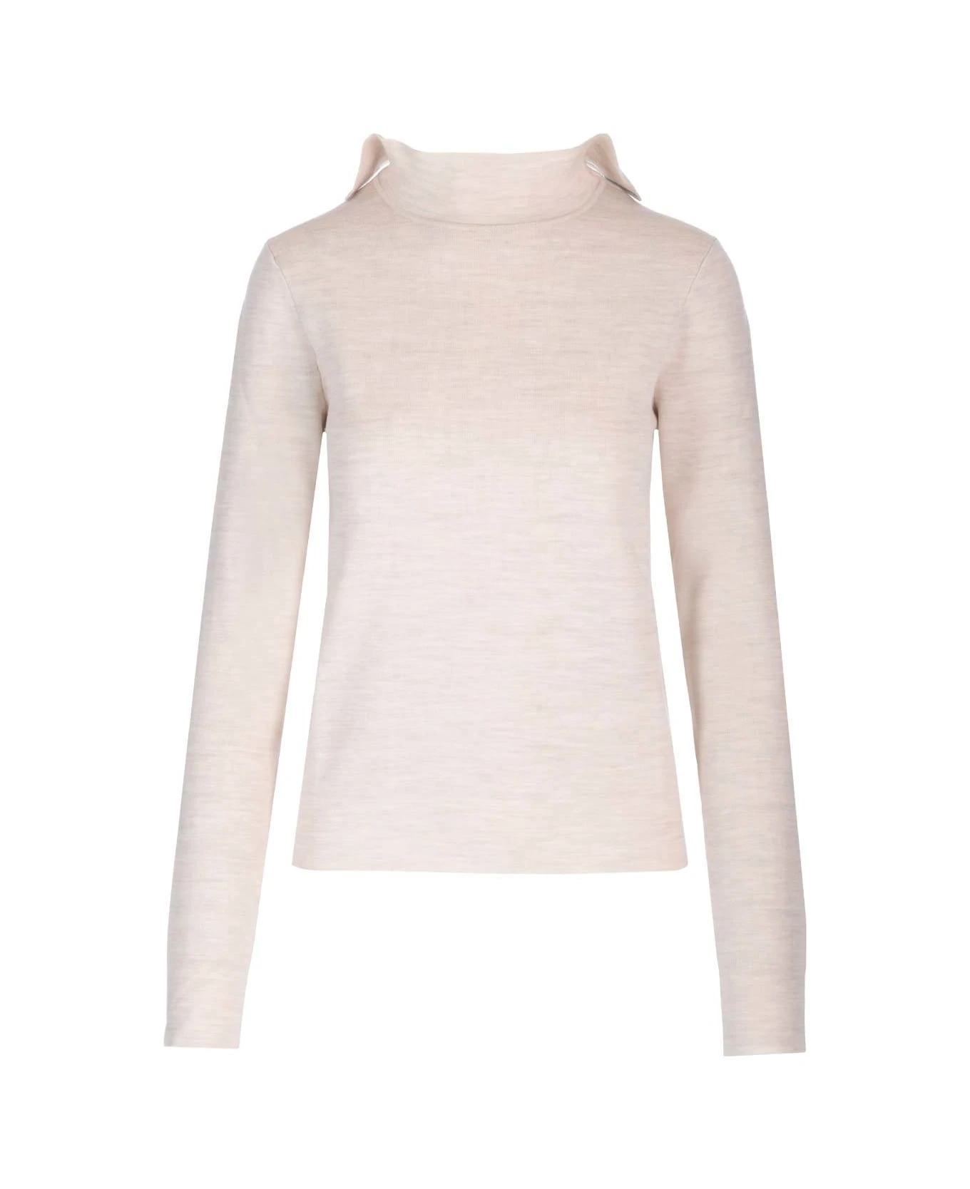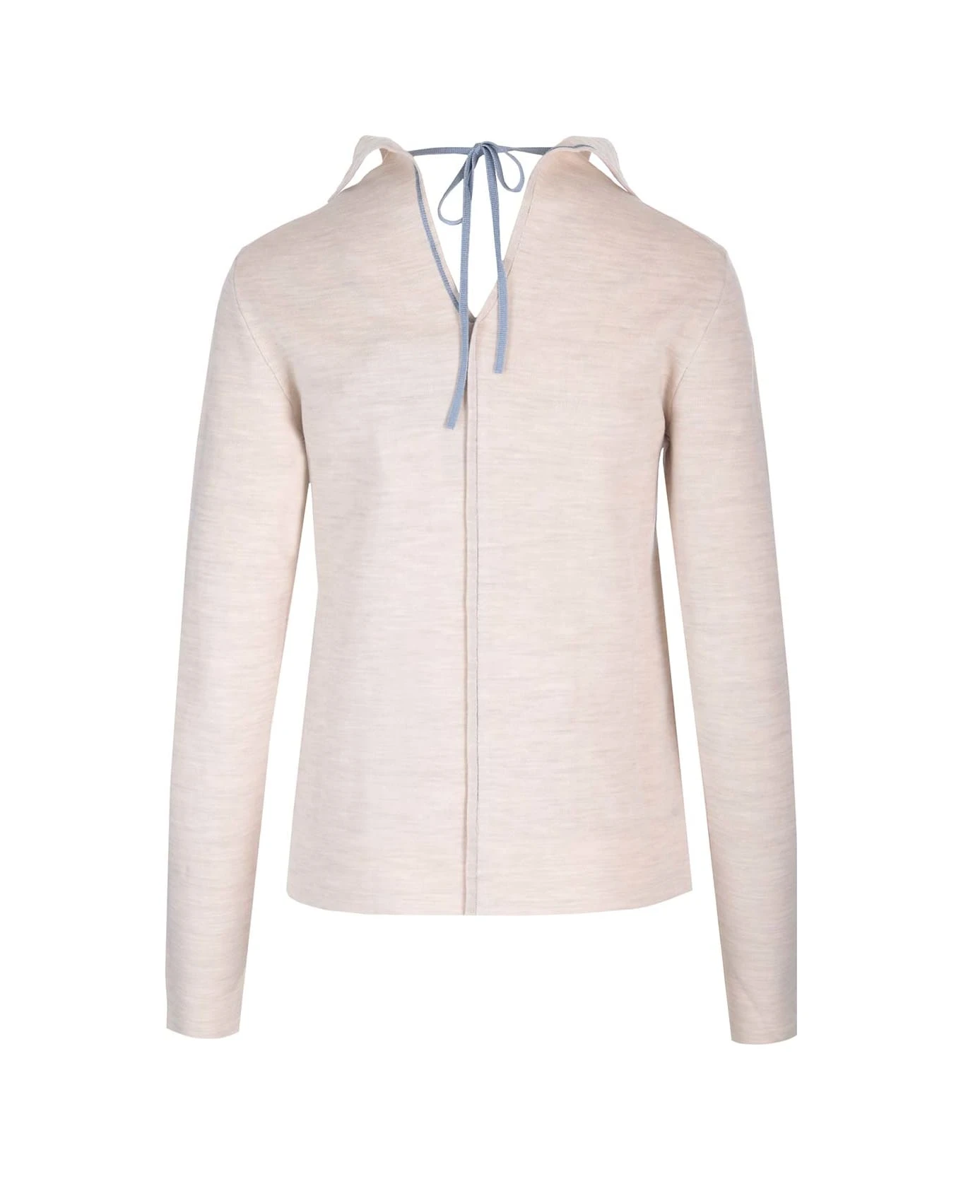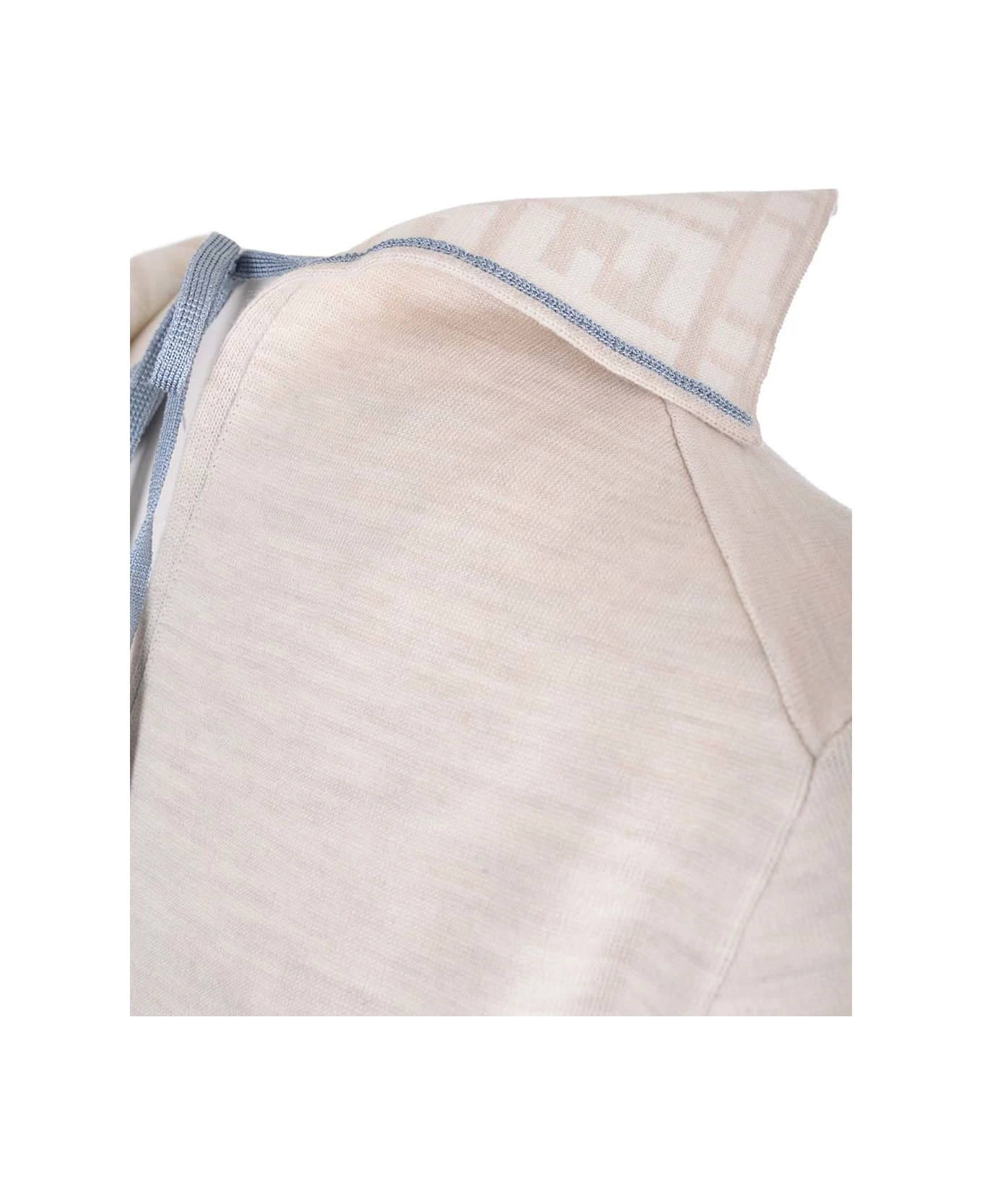 Reversible sweater from Fendi in wool, long sleeves, high collar finished with central vent on the back, one side in solid color in shades of beige and the other with all-over FF motif, finished with piping and internal lace to tie on the neck in shades of the blue.
