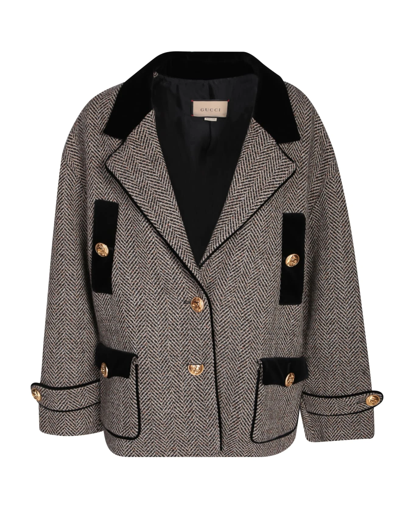 Notched lapels. Single-breasted. Front button fastening. Long sleeves. Drop shoulders. Four front pockets. Logo GG on the button. Herringbone motif. Gold-tone hardware. Color: grey/ brown