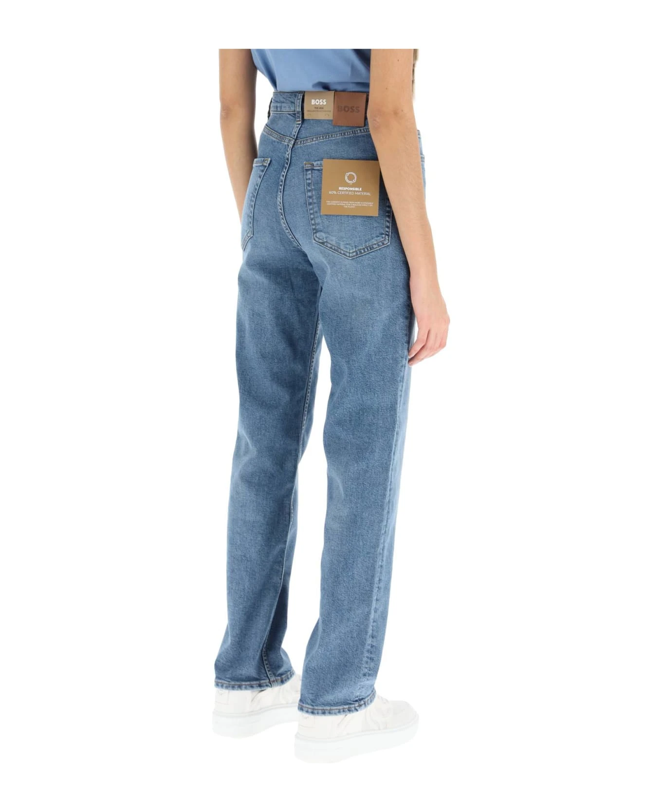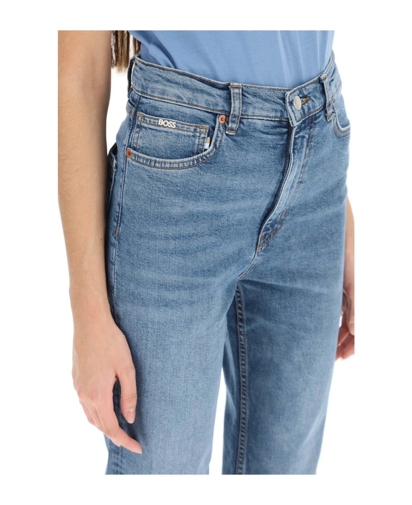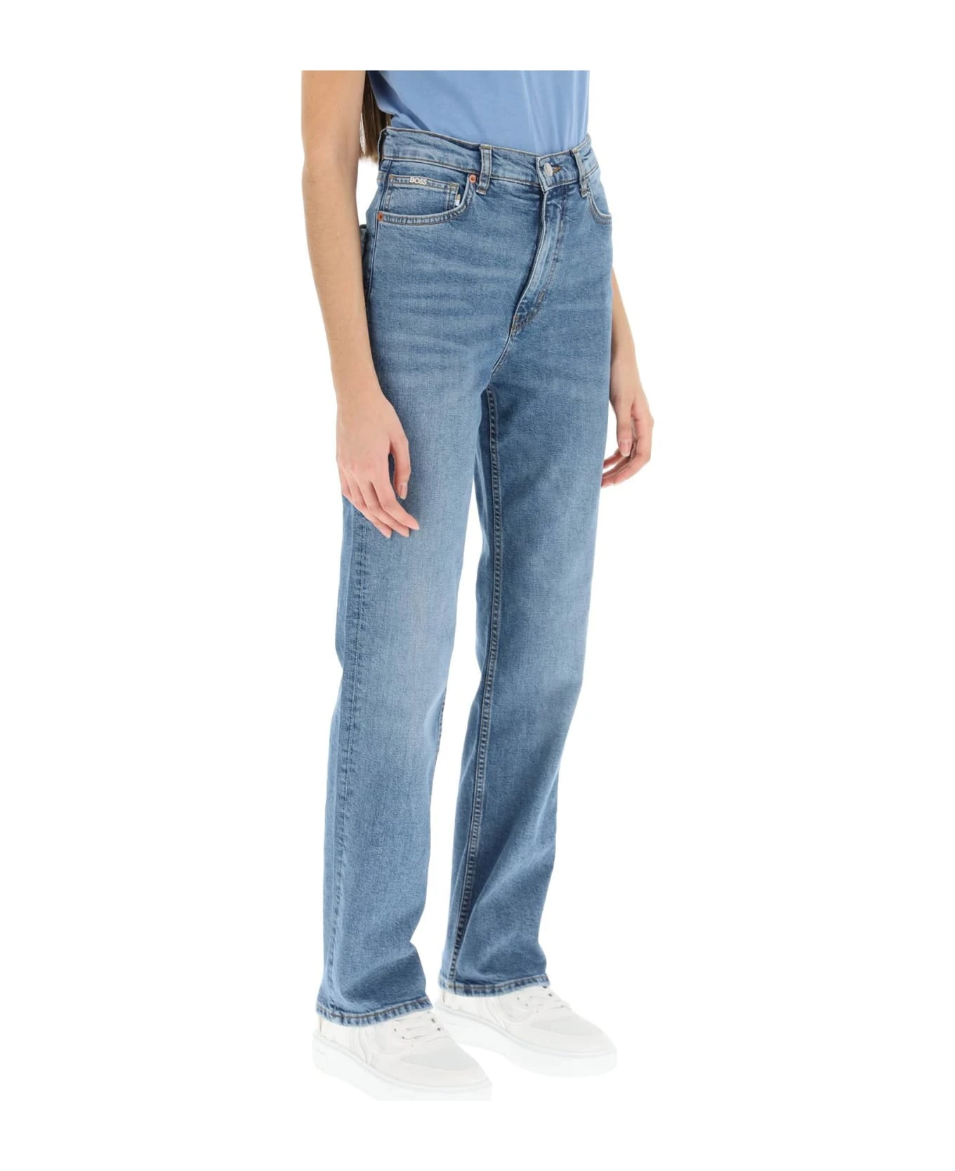 Boss five-pocket jeans in stretch denim with a high-waisted straight cut. Finished with contrast stitching, belt loops, and metal logo lettering on the front pocket. Zip fly with top button. Regular fit. The model is 177 cm tall and wears a size 26.