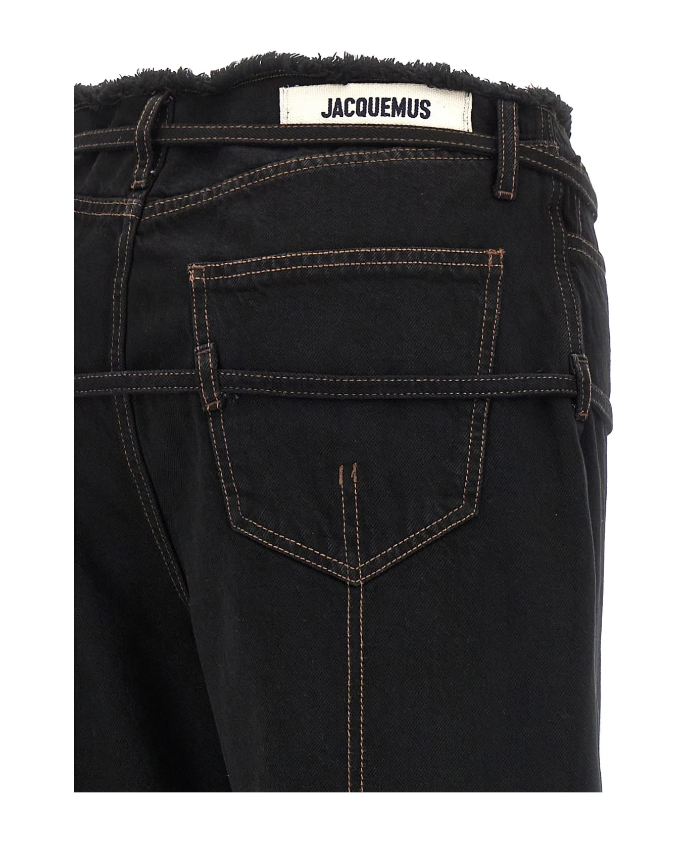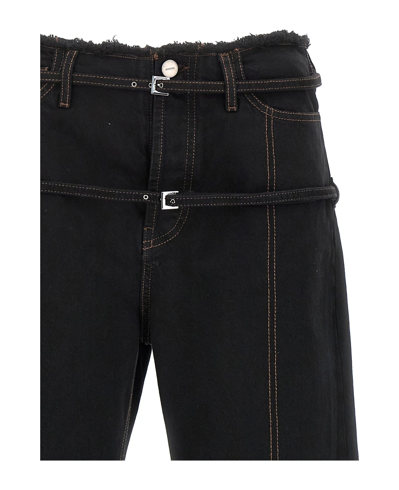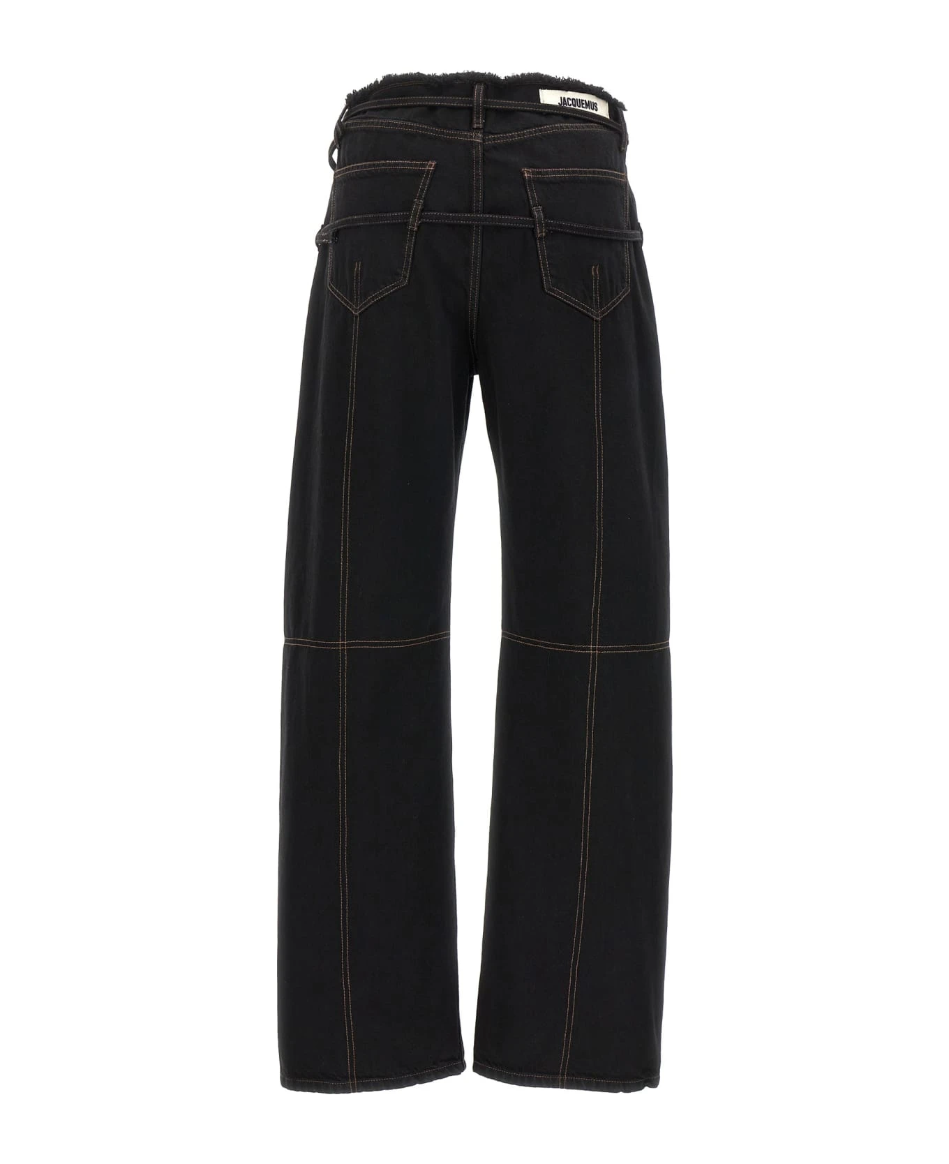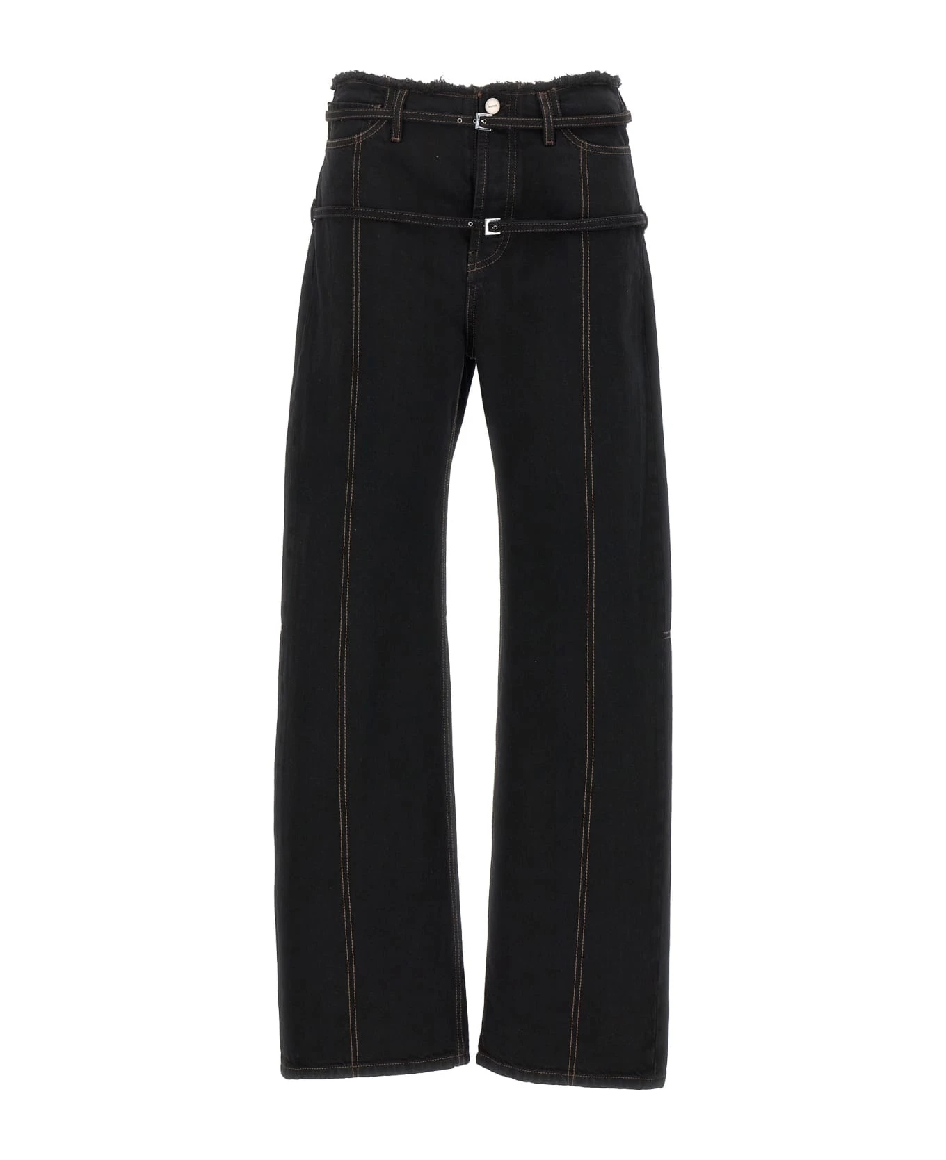 ‘Le de Nîmes Caraco’ low-waisted cotton denim jeans with wide leg, frayed waist, zip and button closure, strap detail.