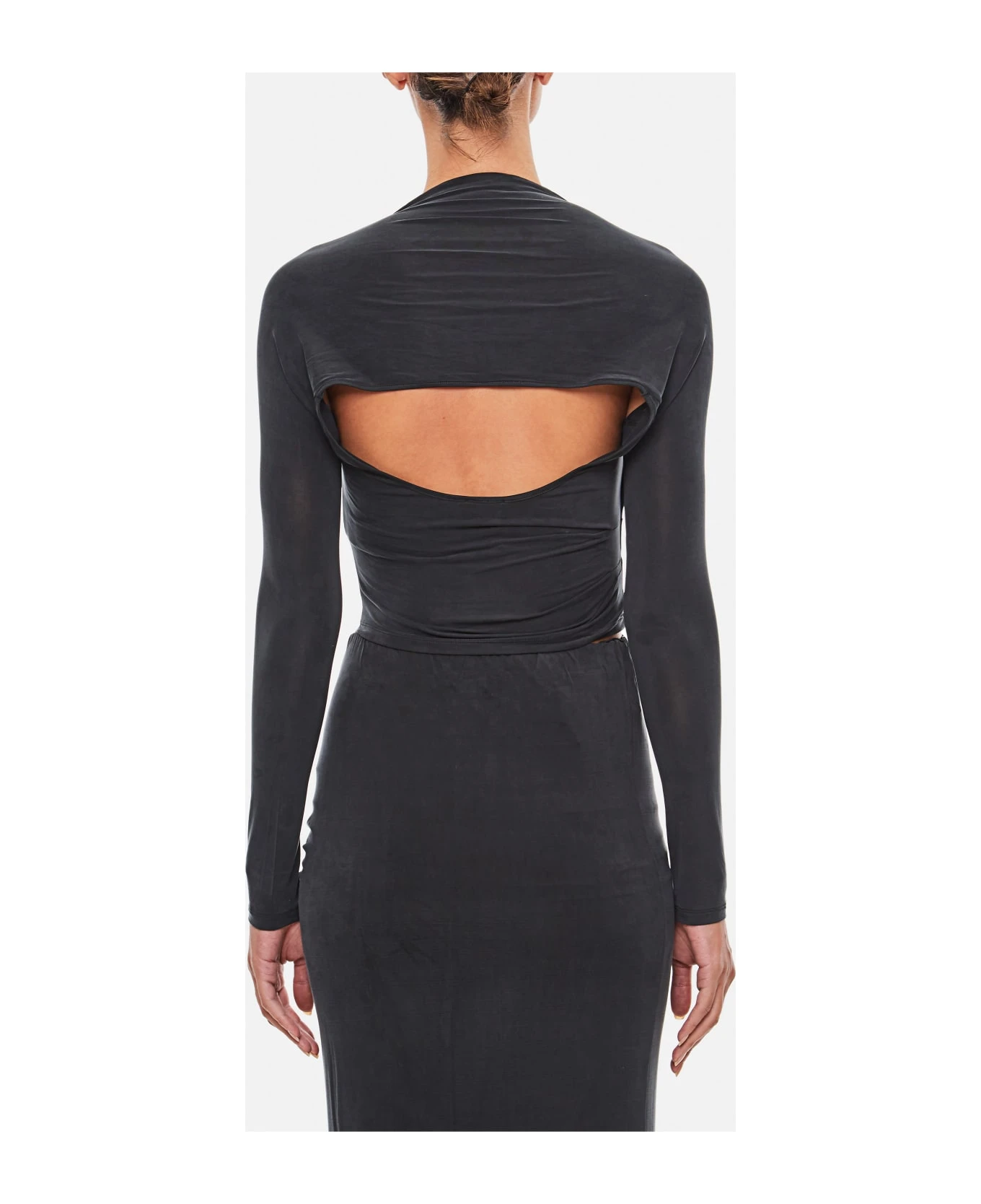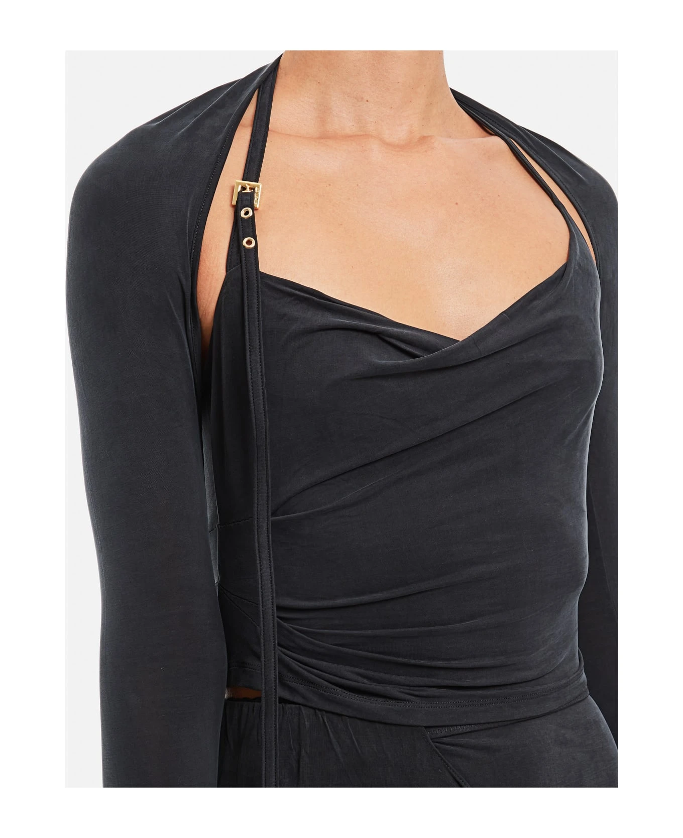 Asymmetric neckline. Thin straps with cutouts. Chest draping. Cropped fit. Long bolero style sleeves. Slim fit. Color: black.