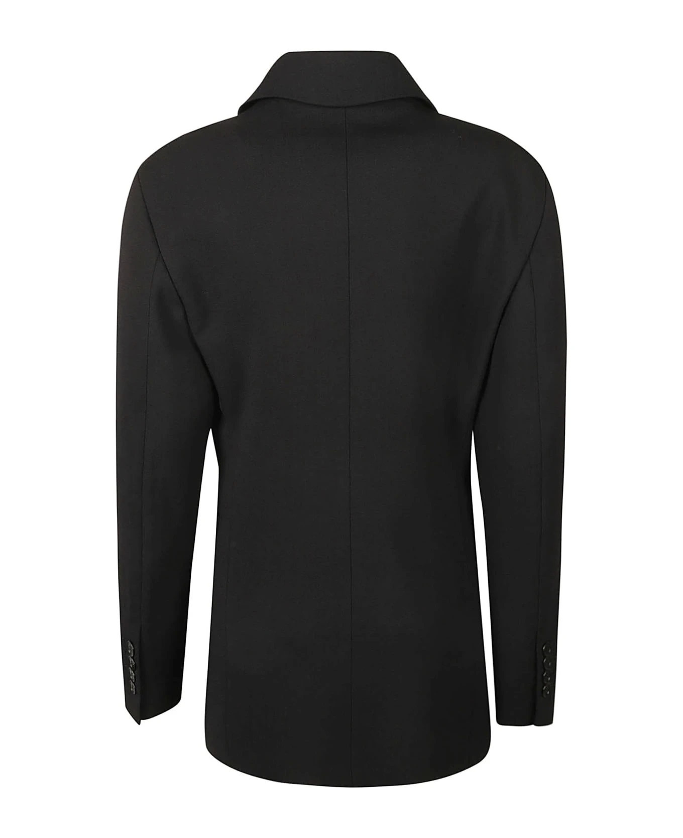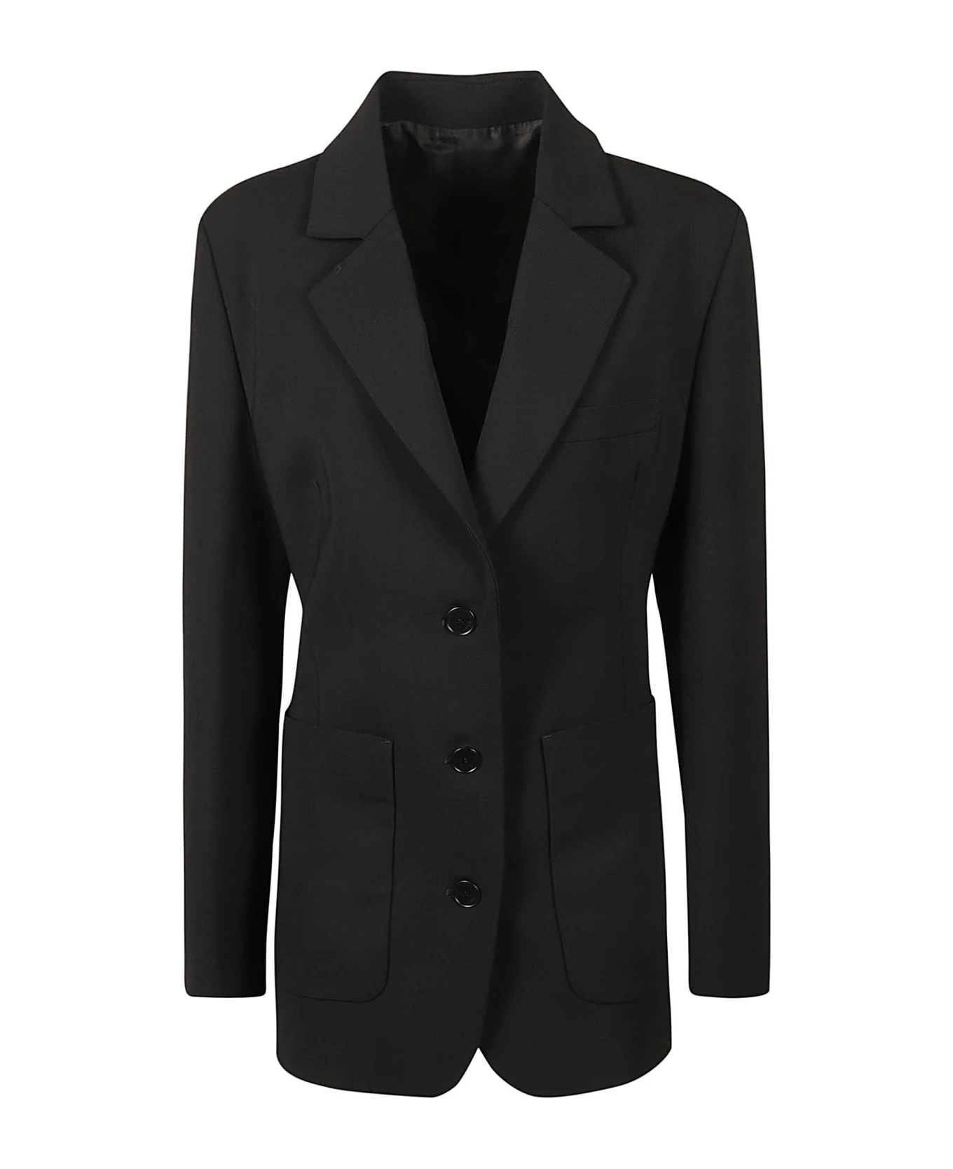 single-breasted blazer from Lanvin featuring black, virgin wool blend, notched lapels, shoulder pads, long sleeves, buttoned cuffs, front button fastening, chest welt pocket, two front patch pockets, straight hem and full lining.