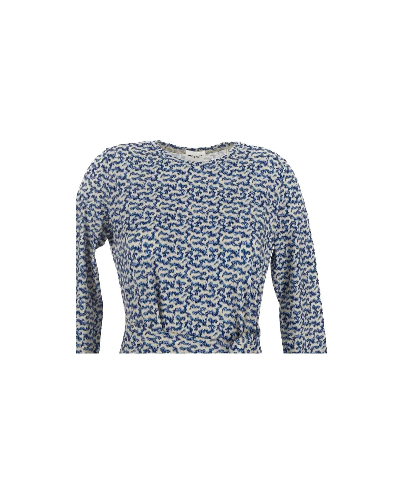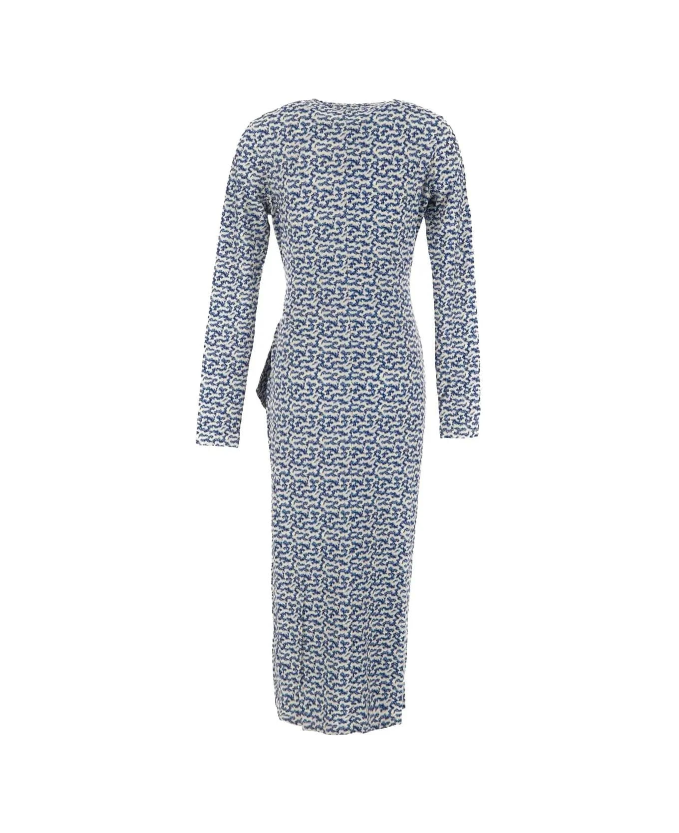 Isabel Marant Etoile wrap-around midi dress in blue/ecru viscose with abstract print, long sleeves, a round neckline, tight fit and bands to tied at side creating a draped skirt effect.