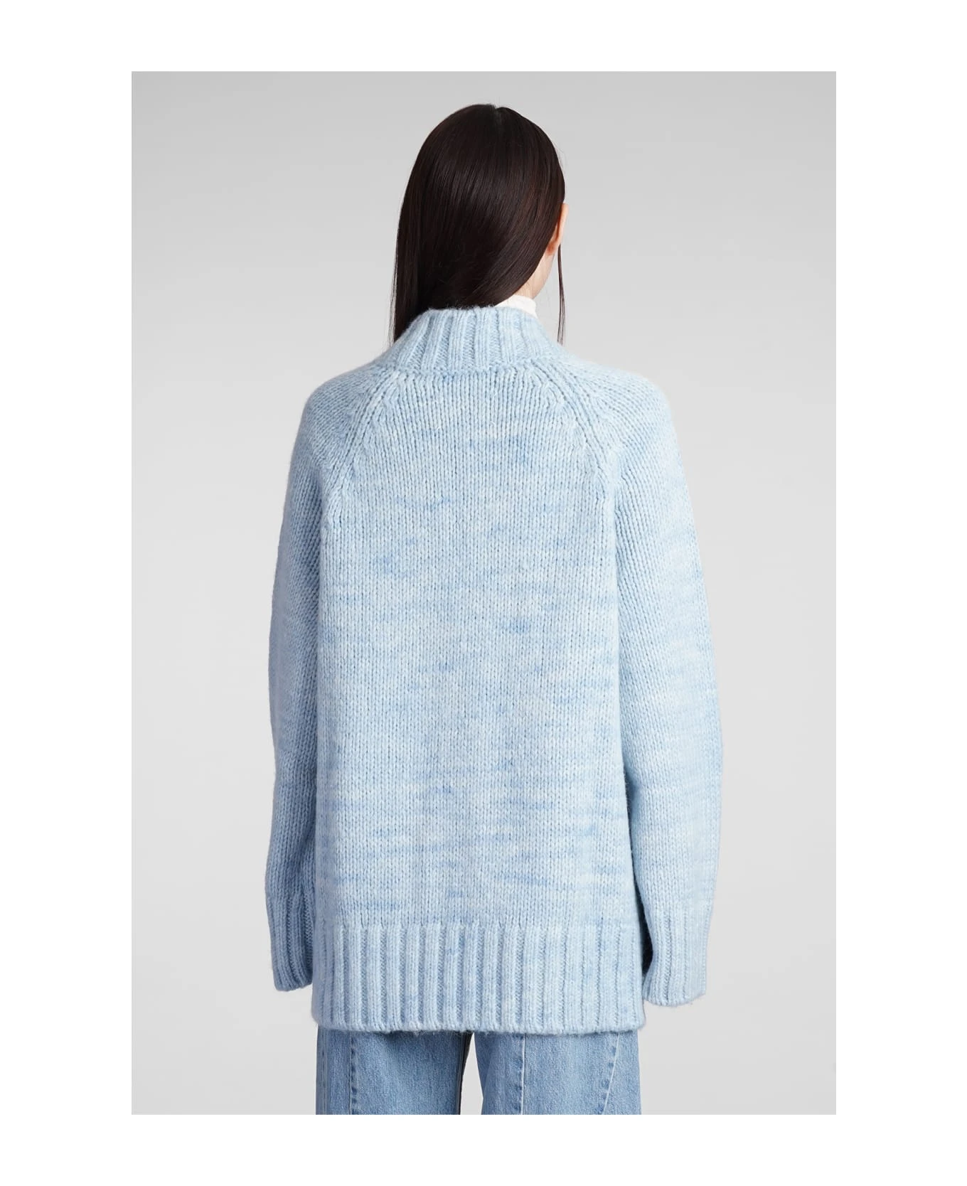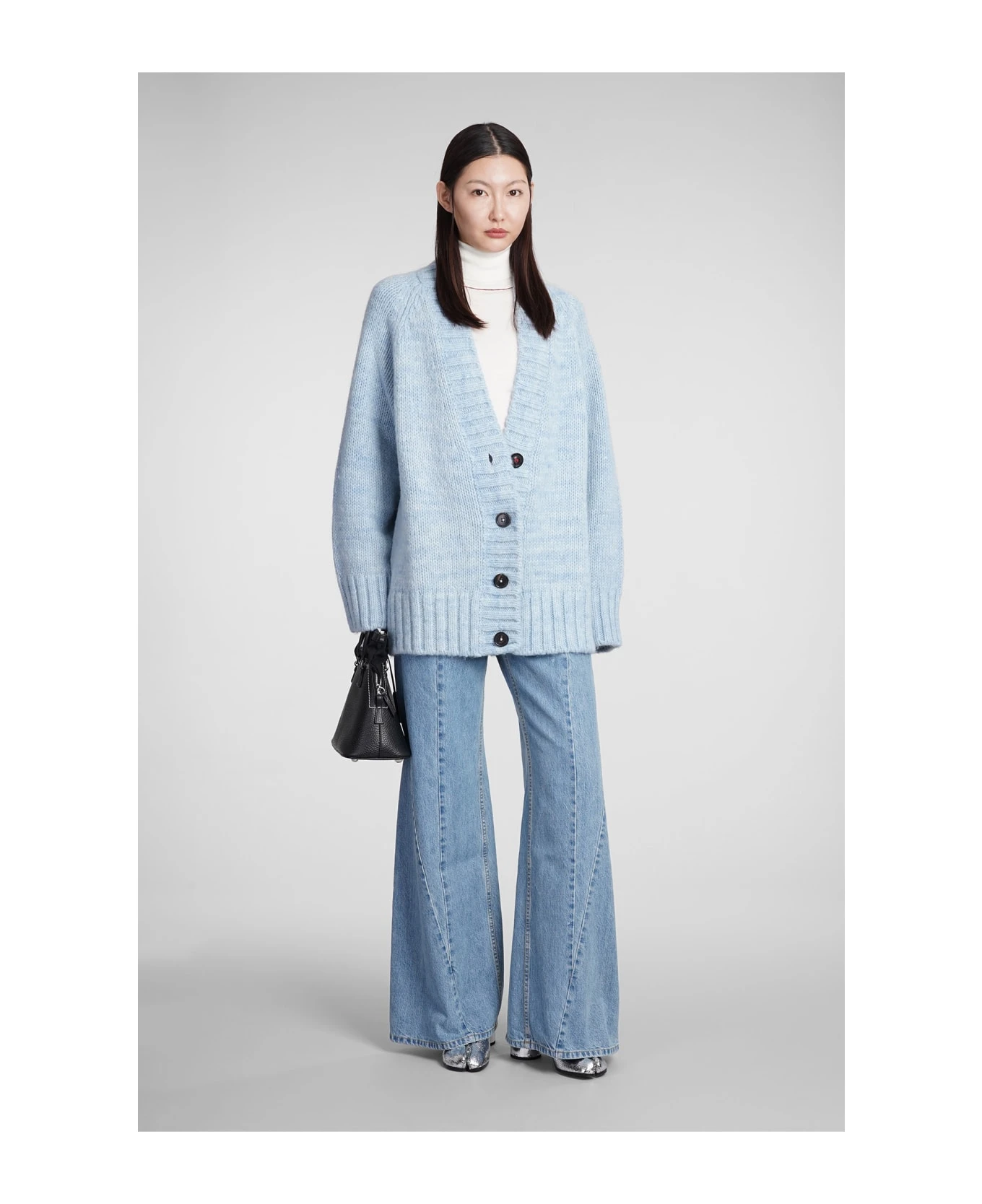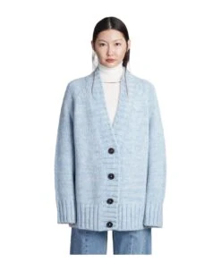 Cardigan in cyan wool, V neck, frontal buttoning, long sleeves, ribbed cuffs and bottom, 42% alpaca, 30% cotton, 28% wool, Made in Italy, Model is 180 cm and wear a size S