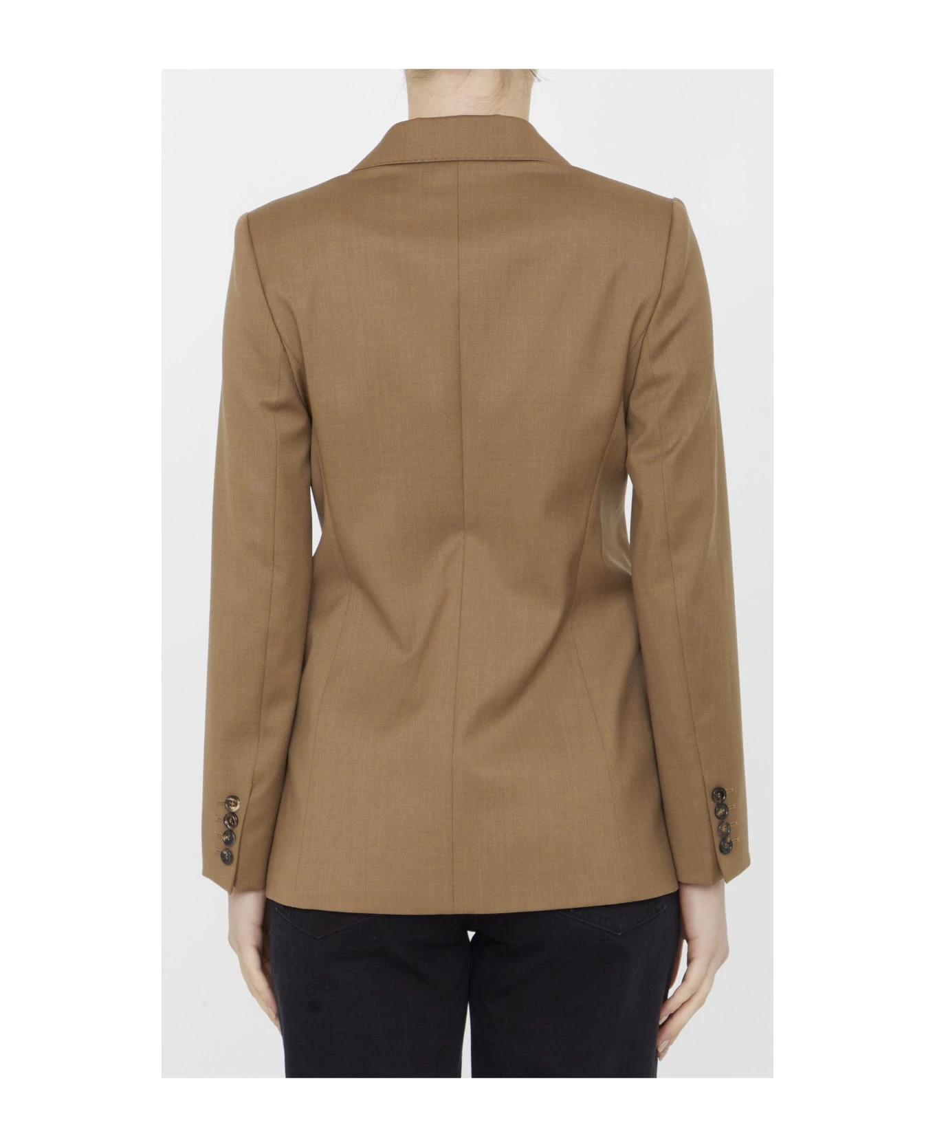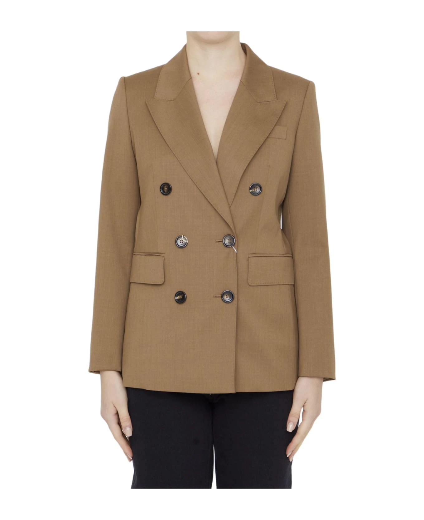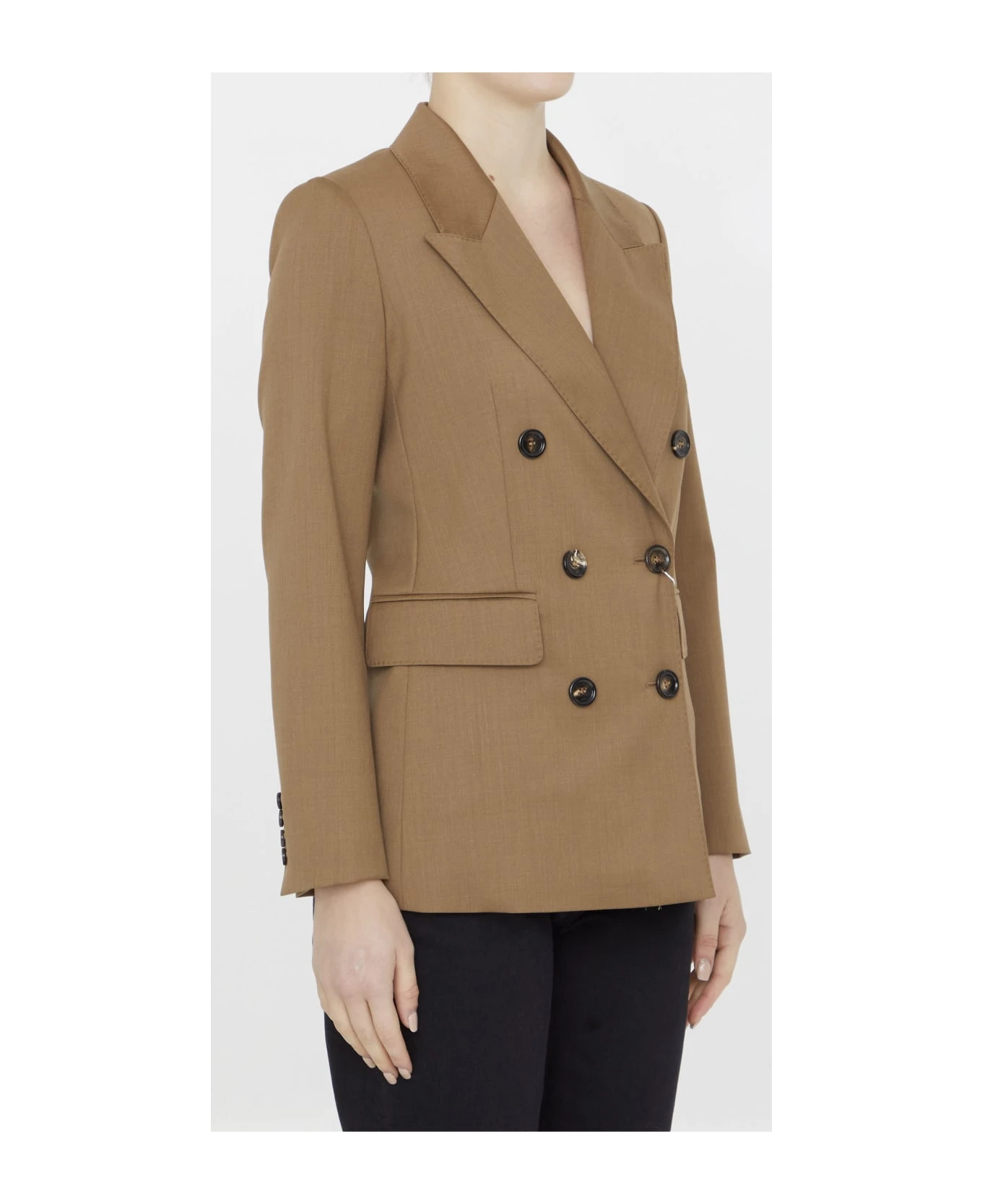 Double-breasted Oppio jacket in camel-colored virgin wool. It features peaked lapels, front six-button closure, two front flap pockets, a welt pocket on chest and buttoned cuffs. Regular fit.