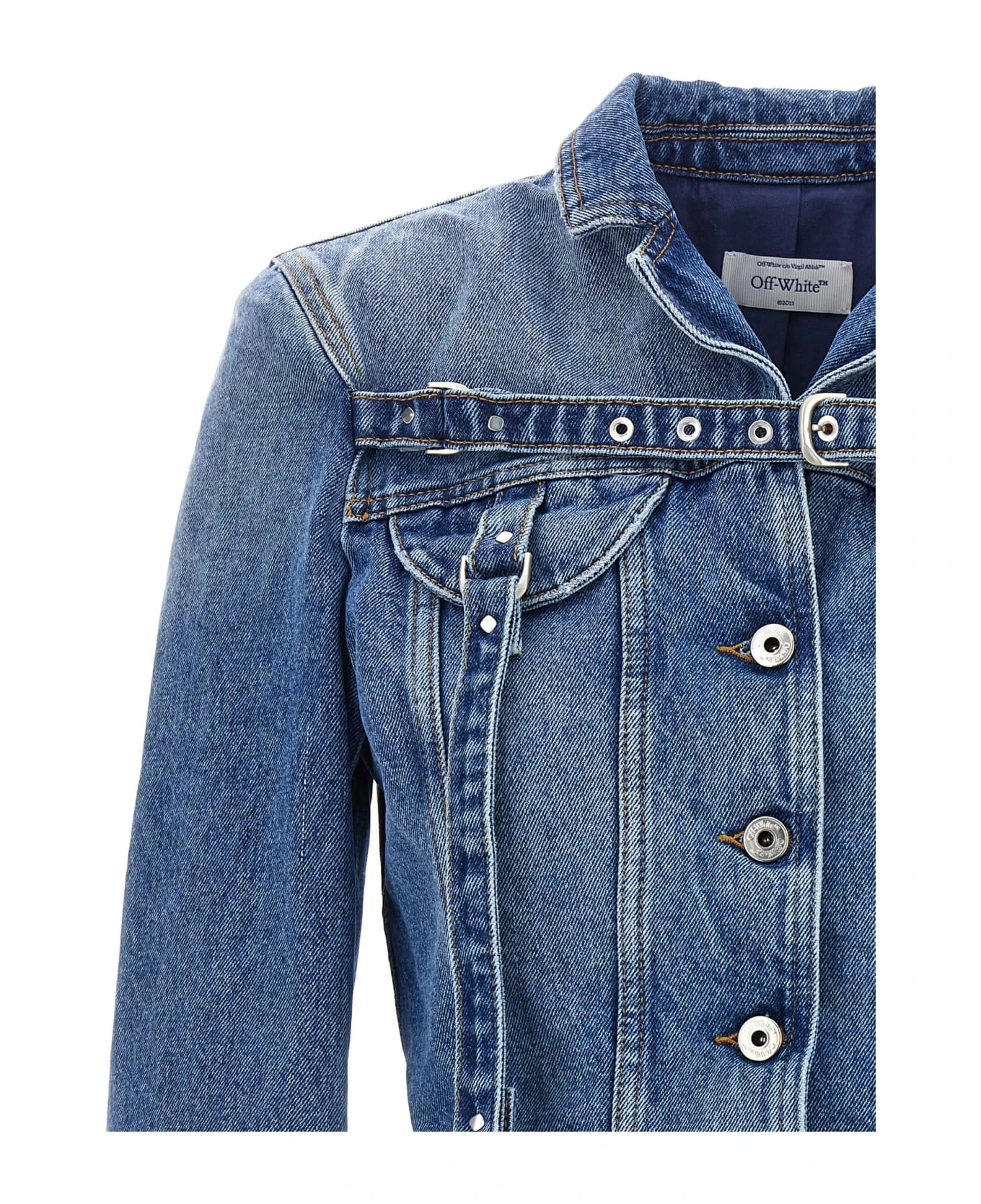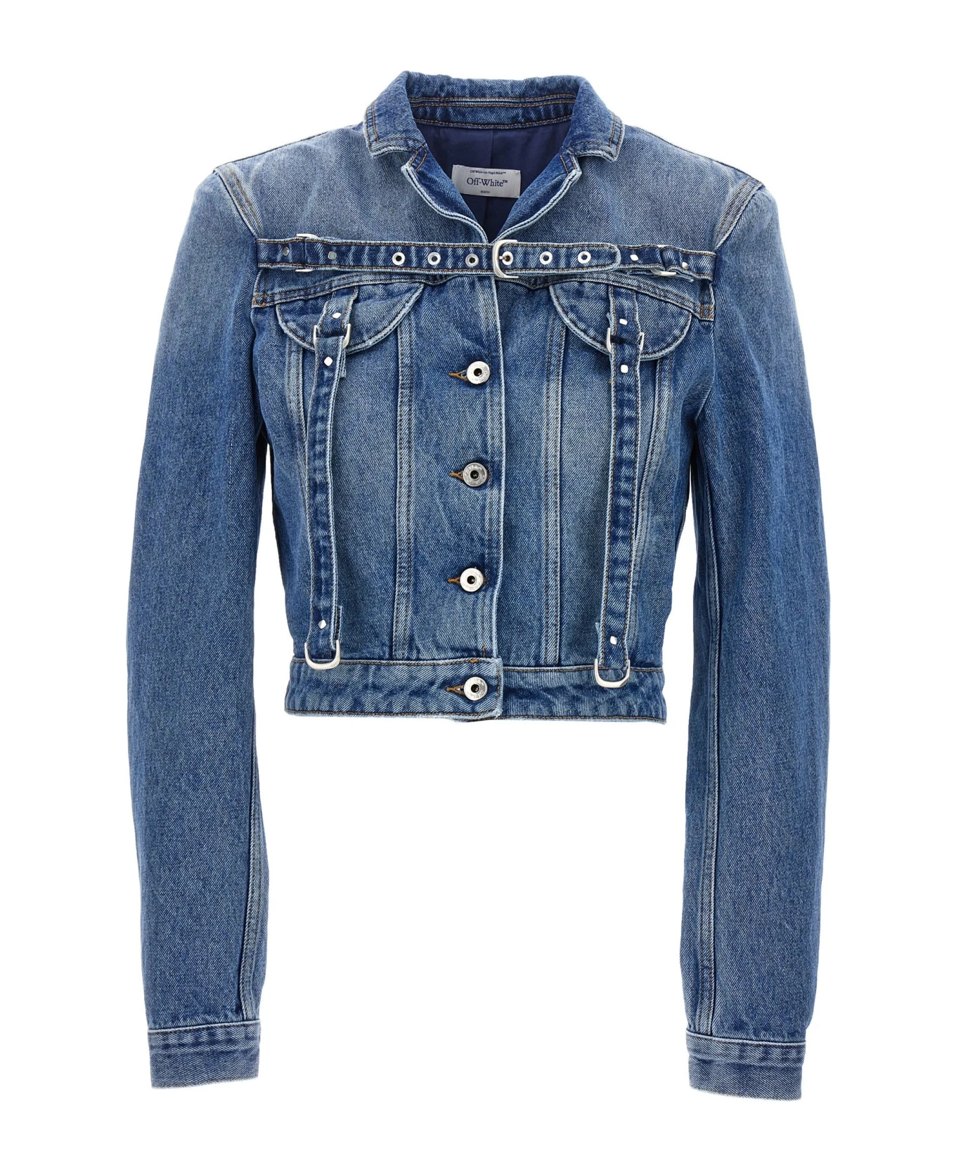 Cropped ‘Cargo Crop’ cotton denim jacket with chest strap detail, button closure and long cuffed sleeves.