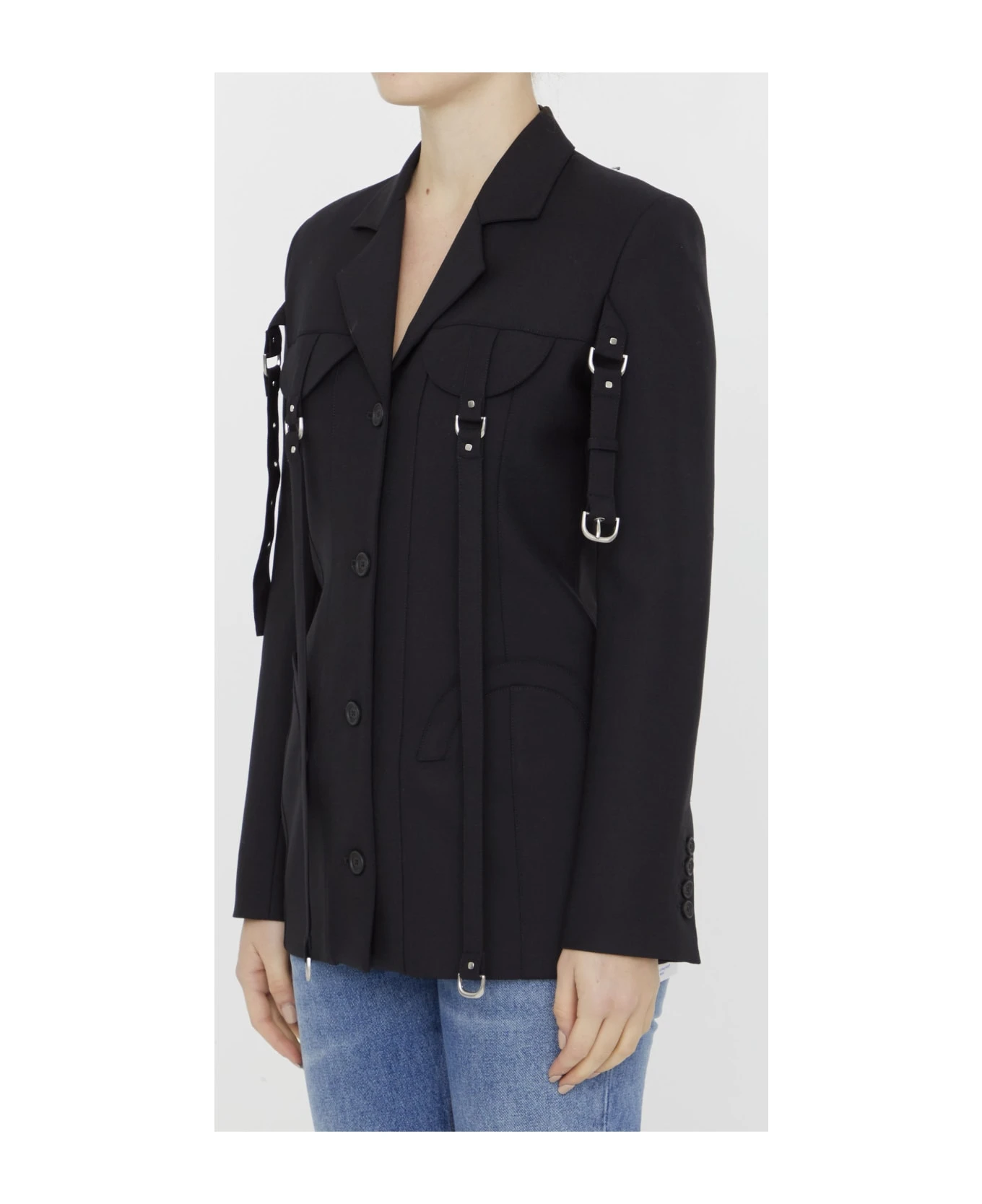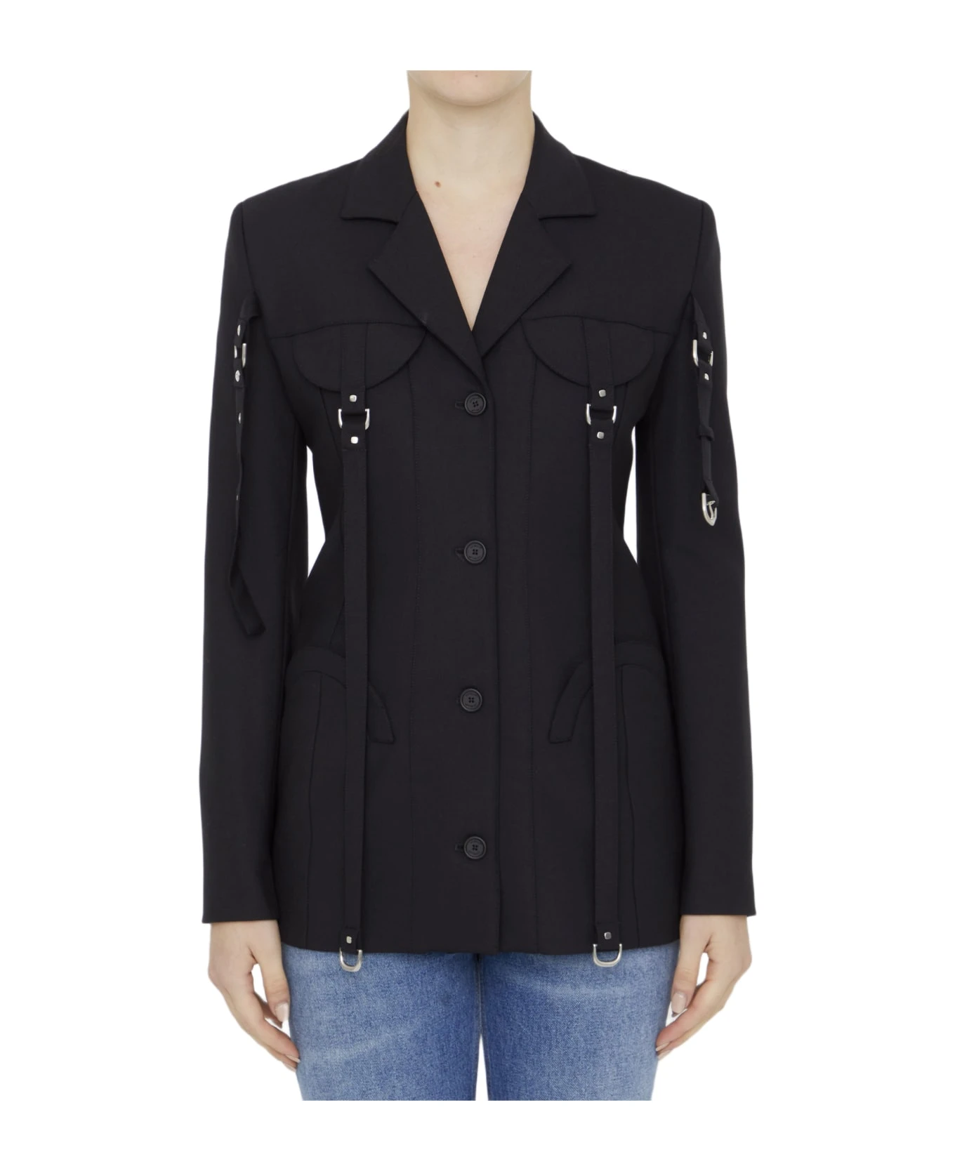 Cargo Round jacket in black nylon and virgin wool blend with front straps. It features notched lapels, front button closure, two flap pockets on chest, two front pockets and buttoned cuffs. Regular fit.