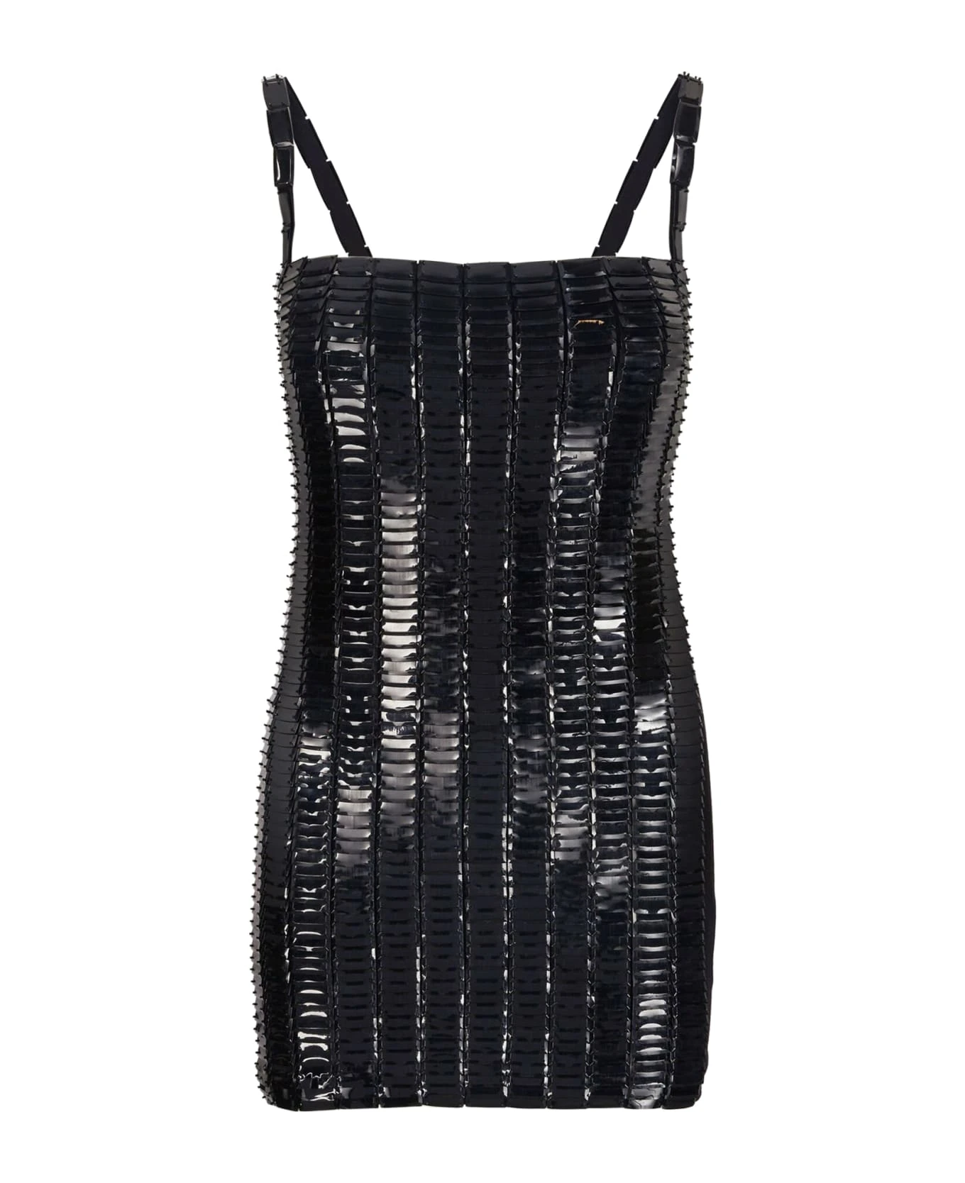 “Rue“ mini dress in black rectangular sequins with deep back neckline and metal logo hook.
