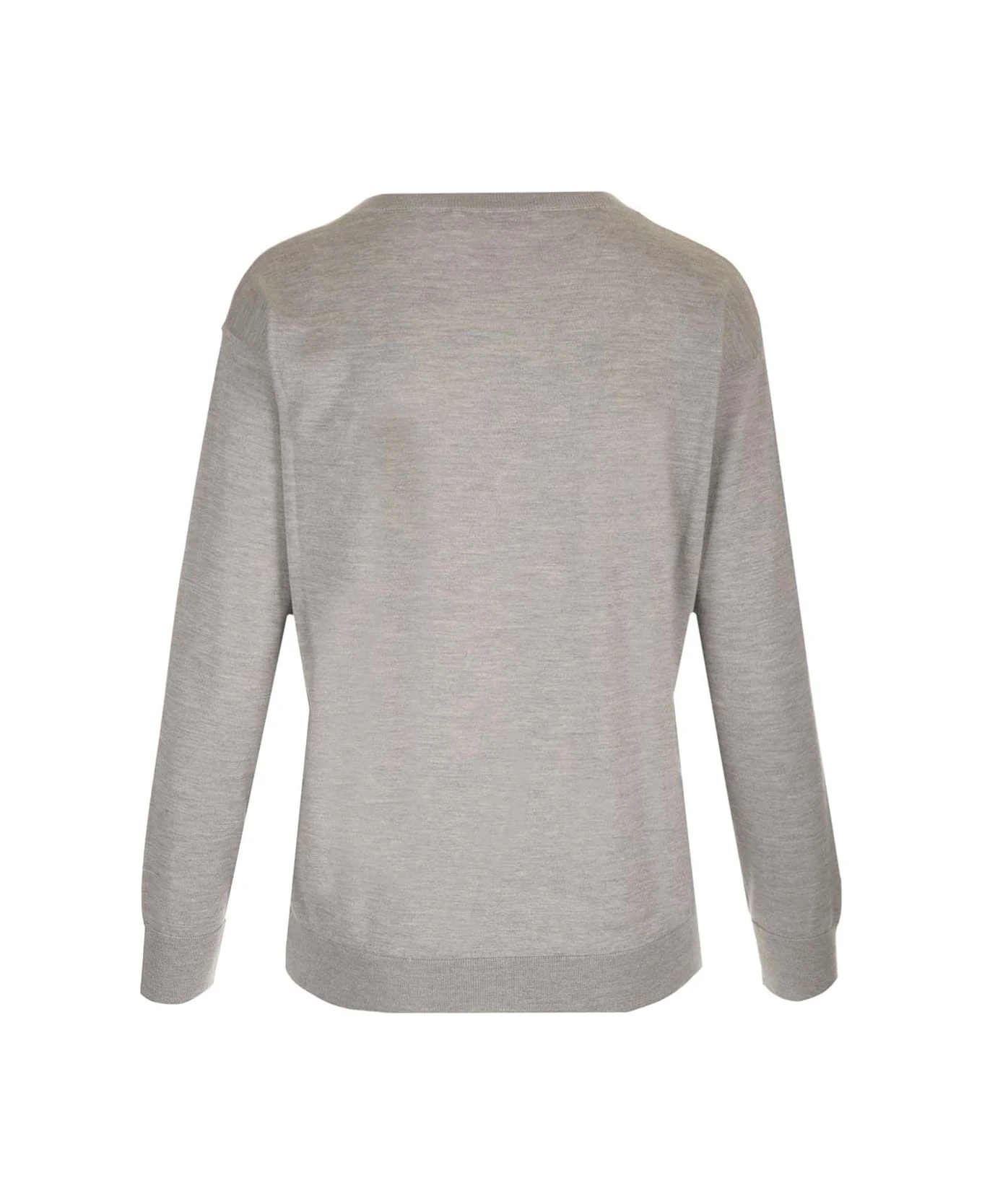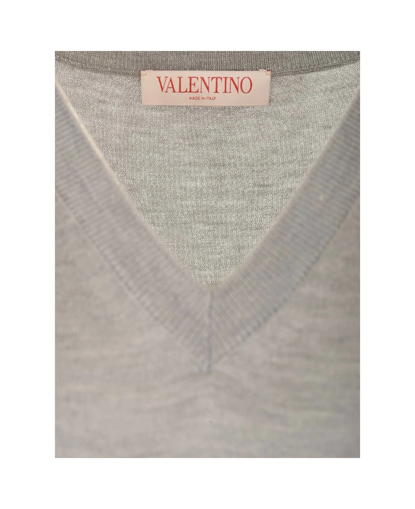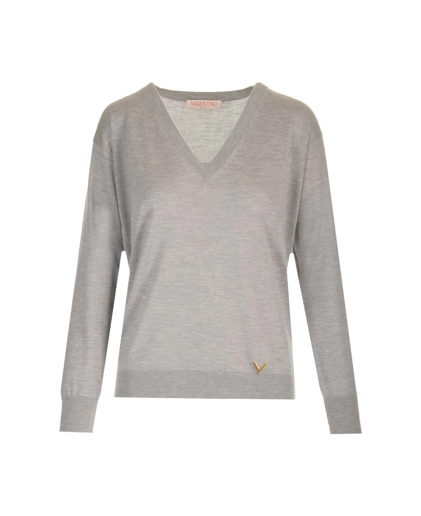 Pearl gray cashmere and silk V-neck pullover with ‘V Logo’ detail and slim fit.