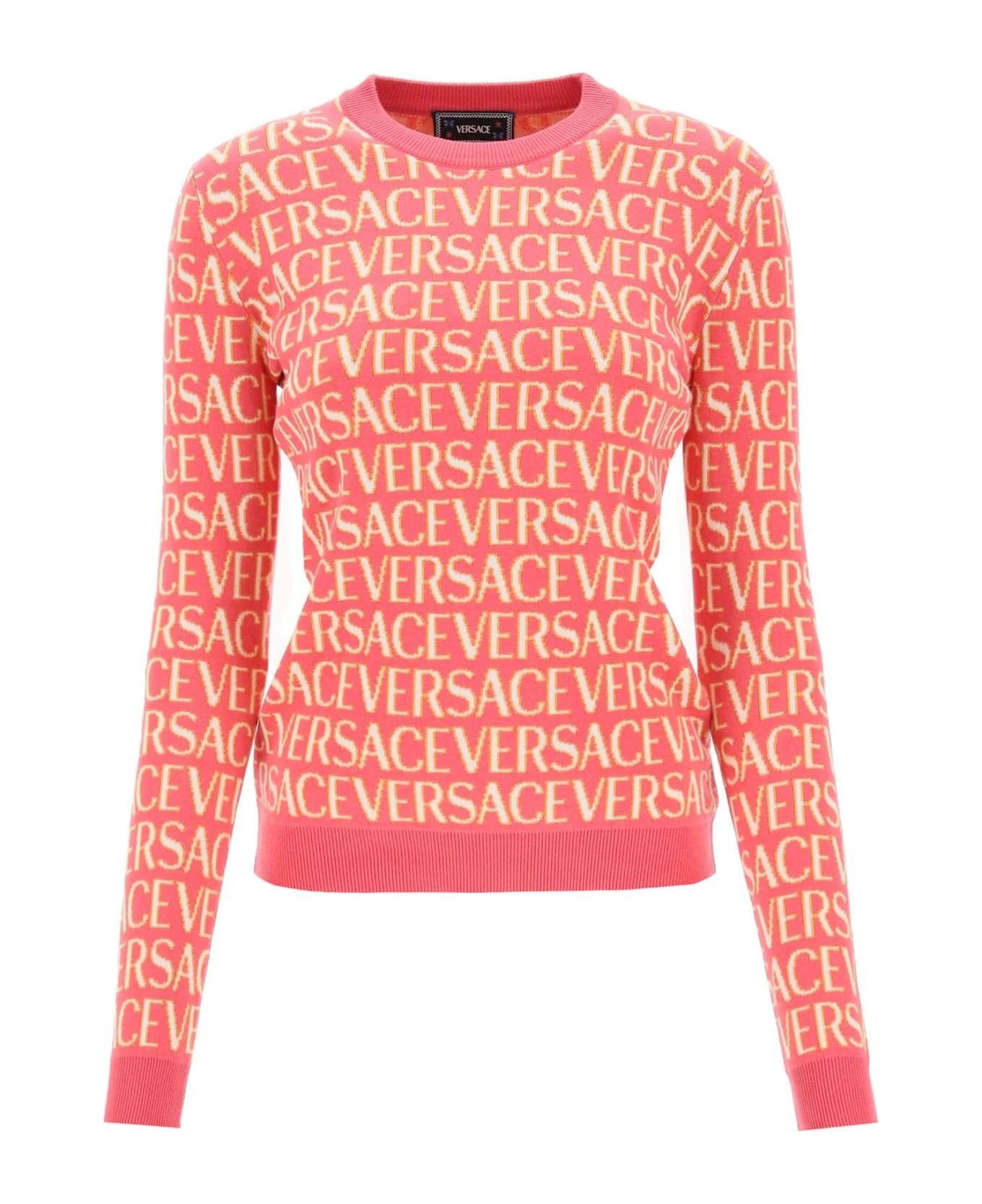 Versace sweater crafted in solid cotton and viscose knit with Versace Allover jacquard pattern. It features ribbed crew neck, cuffs and hem. Slim fit. The model is 177 cm tall and wears size IT 38.