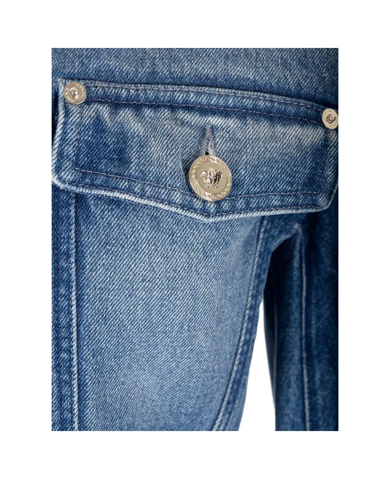 Cropped denim jacket from Versace with padded and rounded couture shoulders, Medusa buttons, pointed collar.