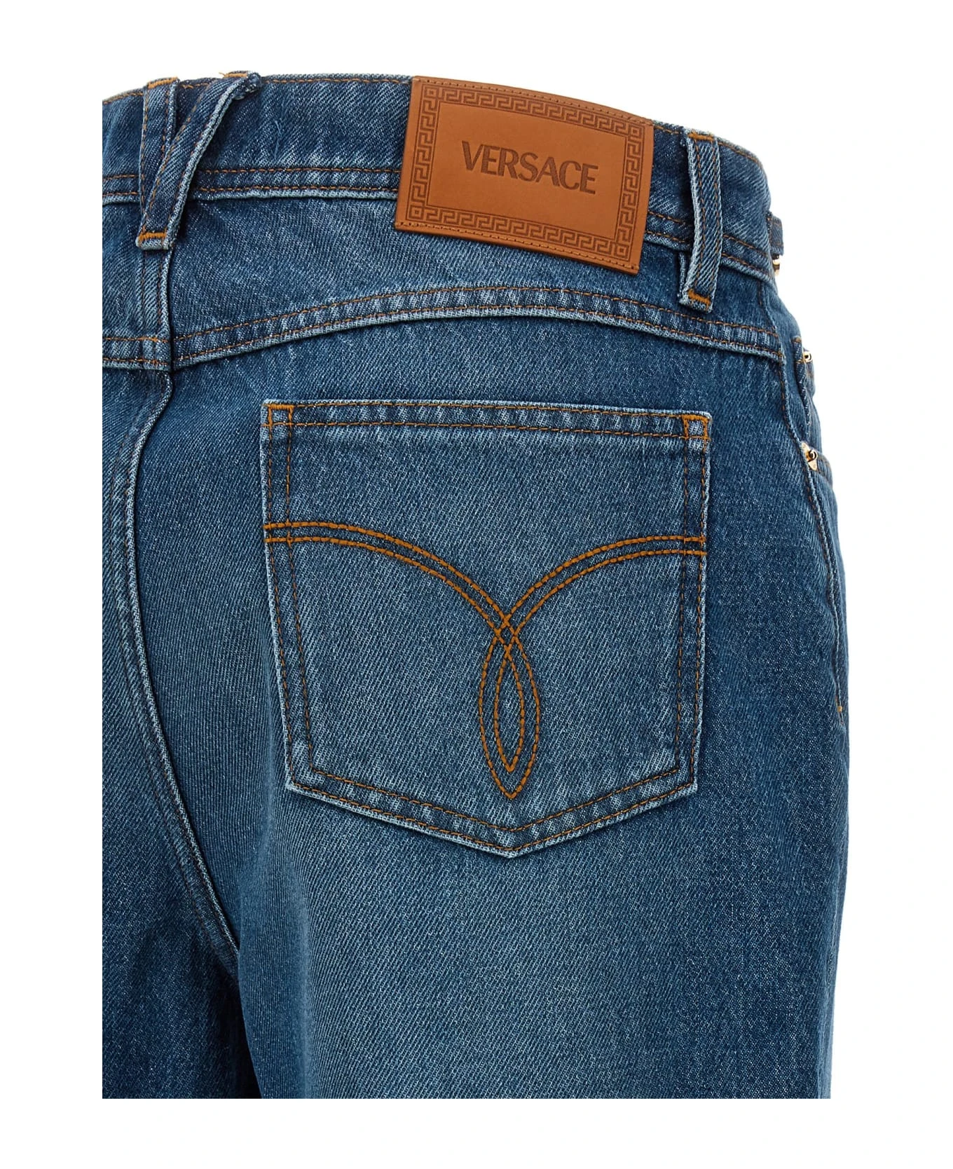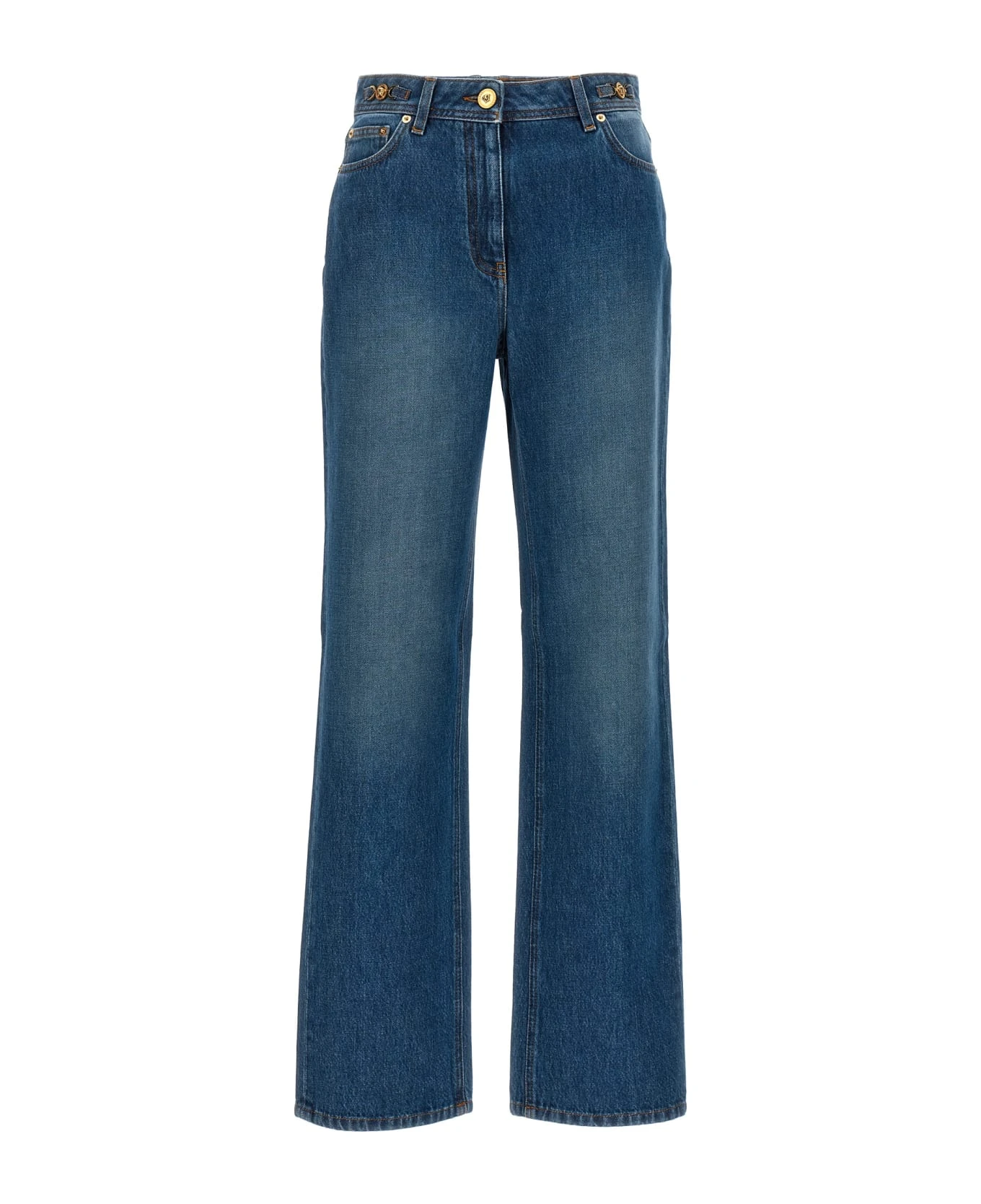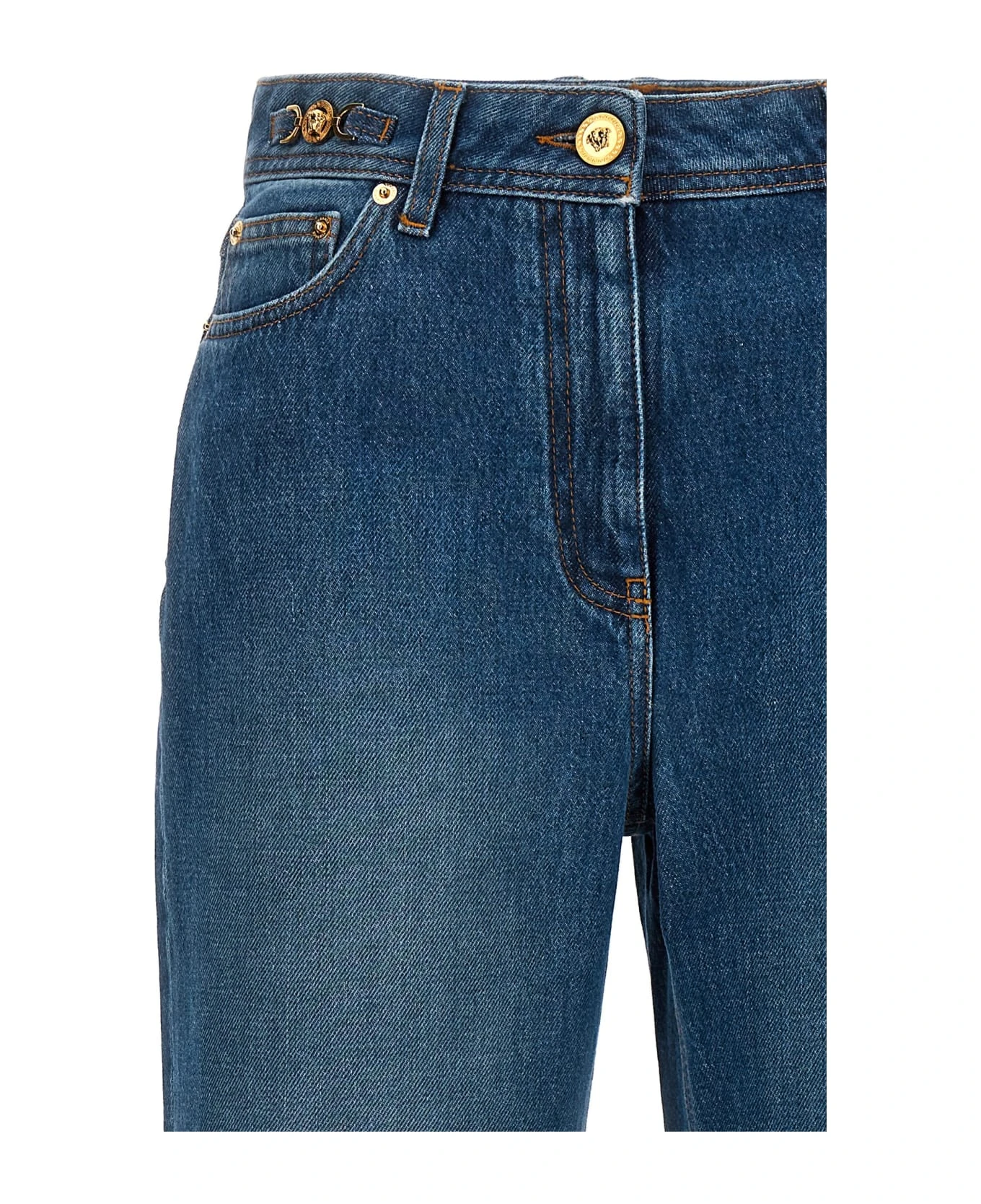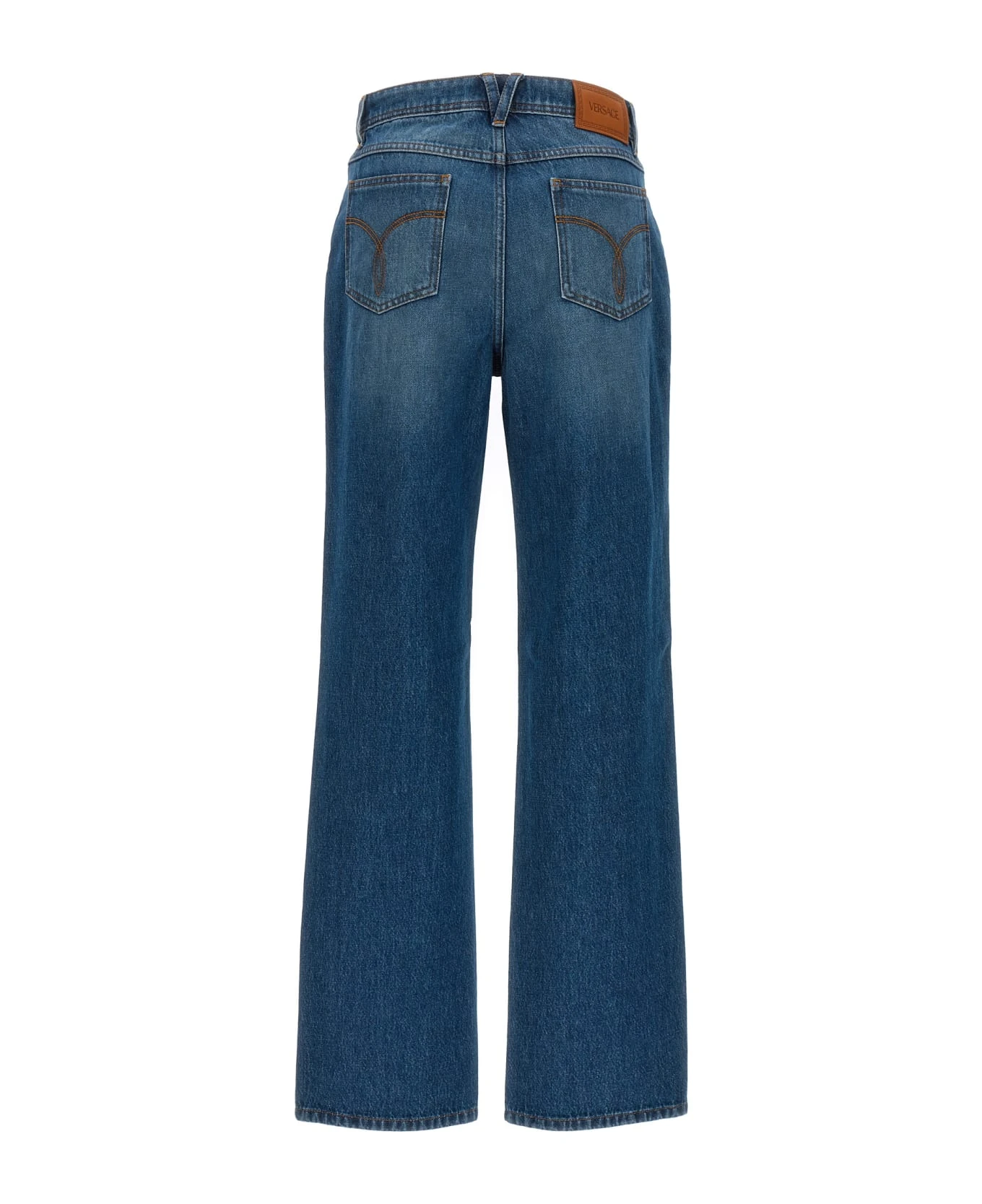 Stone-washed cotton denim jeans with ‘Medusa ’95’ detail, zip and button closure, five pockets, and leather logo label.