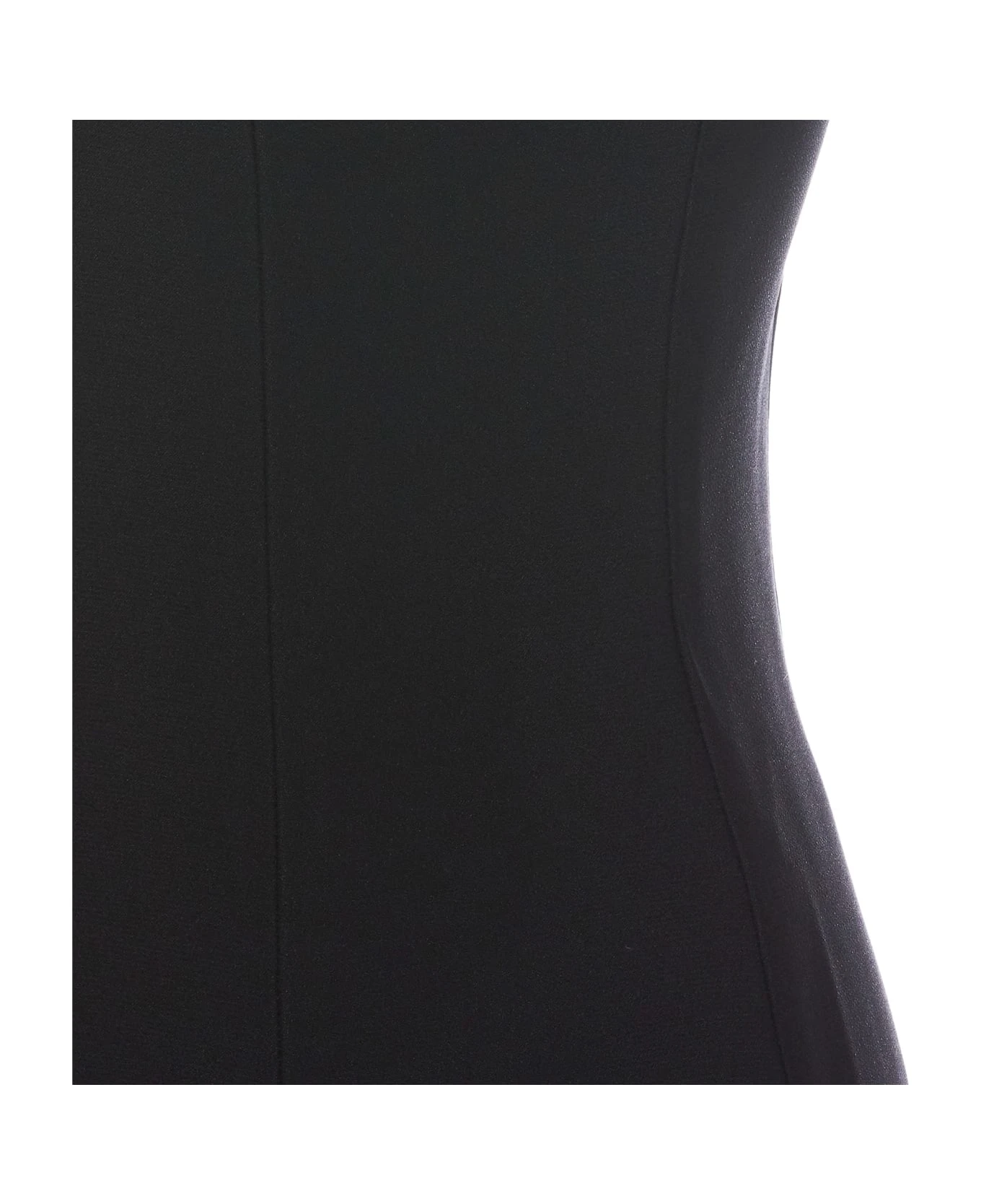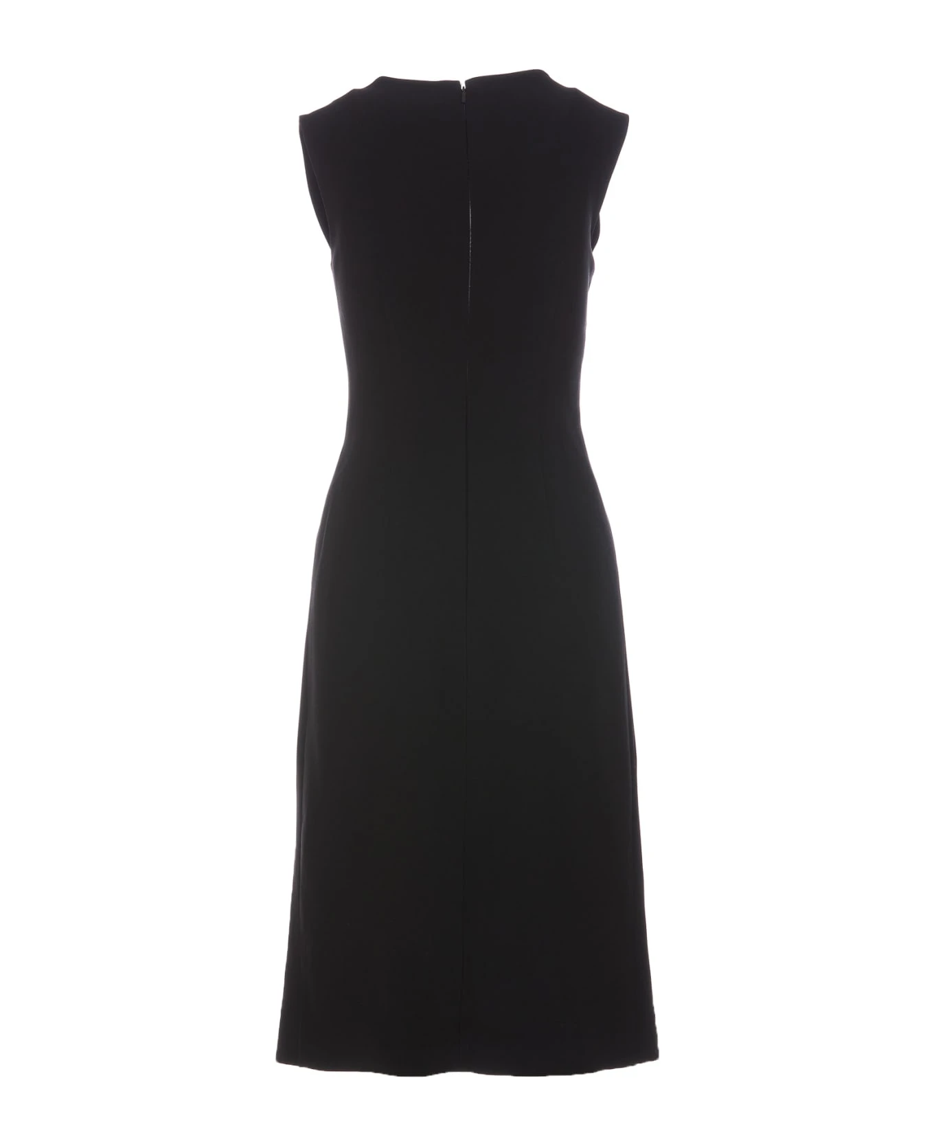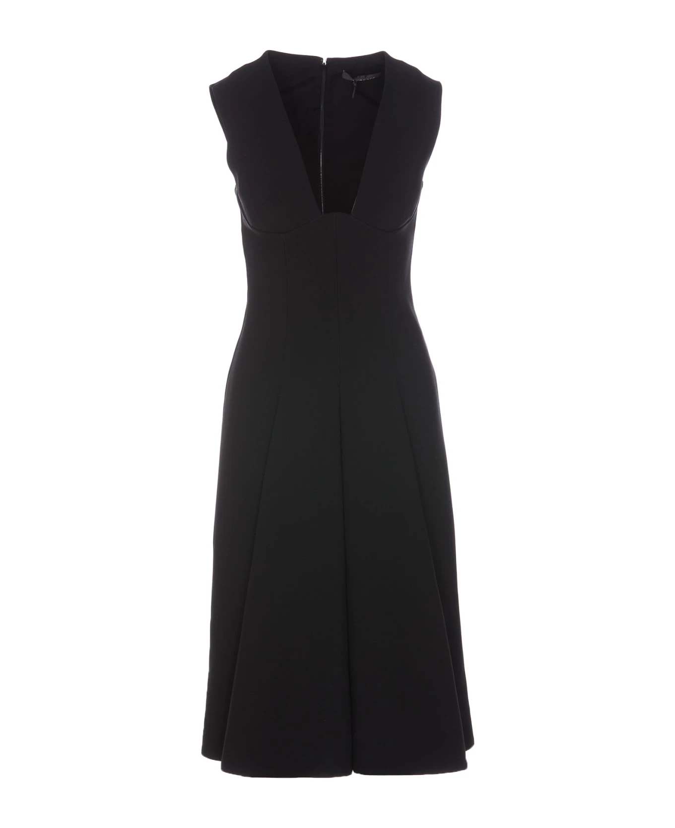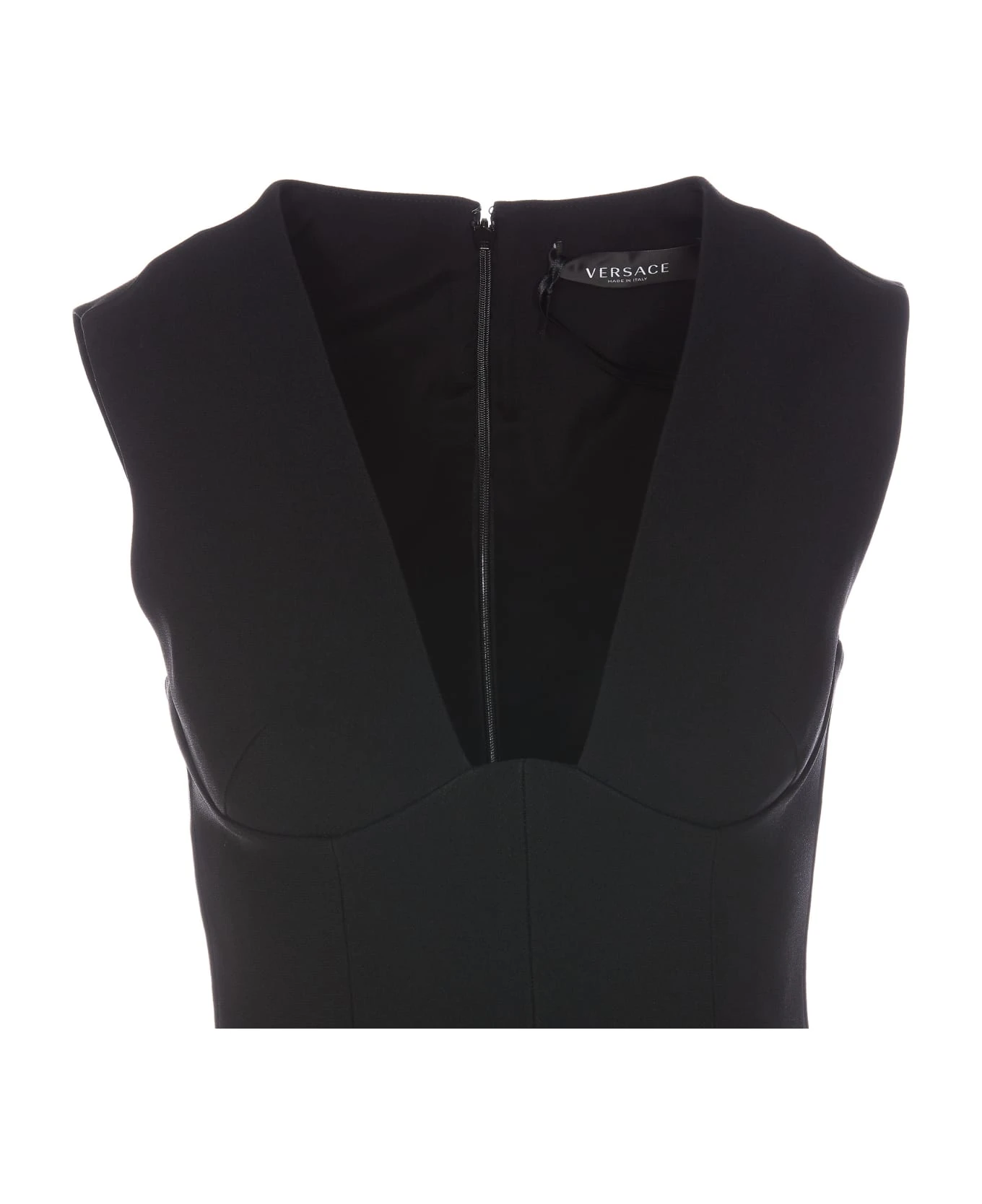 Versace black sleeveless midi dress, v-neck, zip closure on the back, pleated