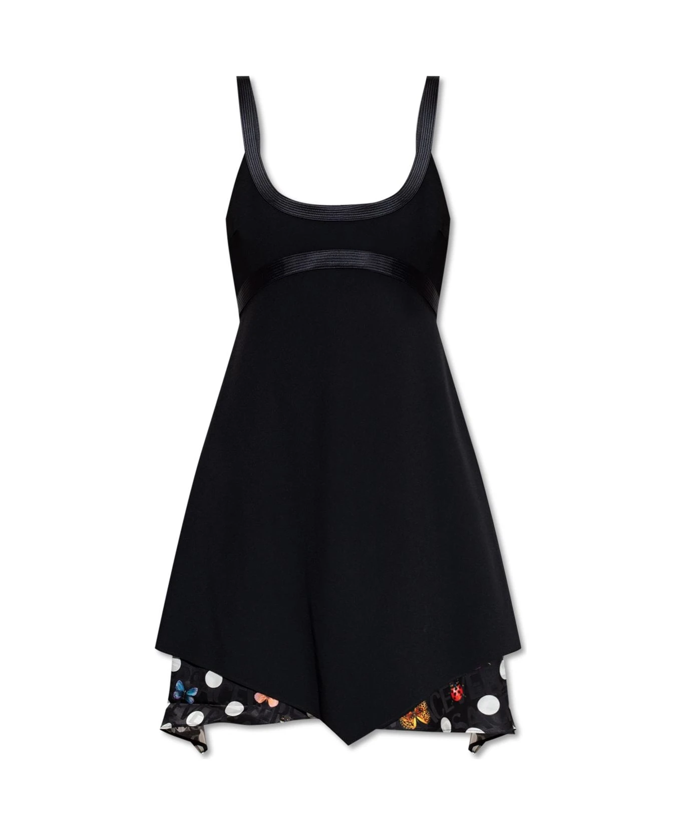 Black layered mini dress from Versace x Dua Lipa, the ‘La Vacanza’ collection. Fastened with a hidden side zipper, this style features a smooth outer layer with side slits and silk taping as well as a jacquard logo pattern and the brand’s ‘Heritage Butter